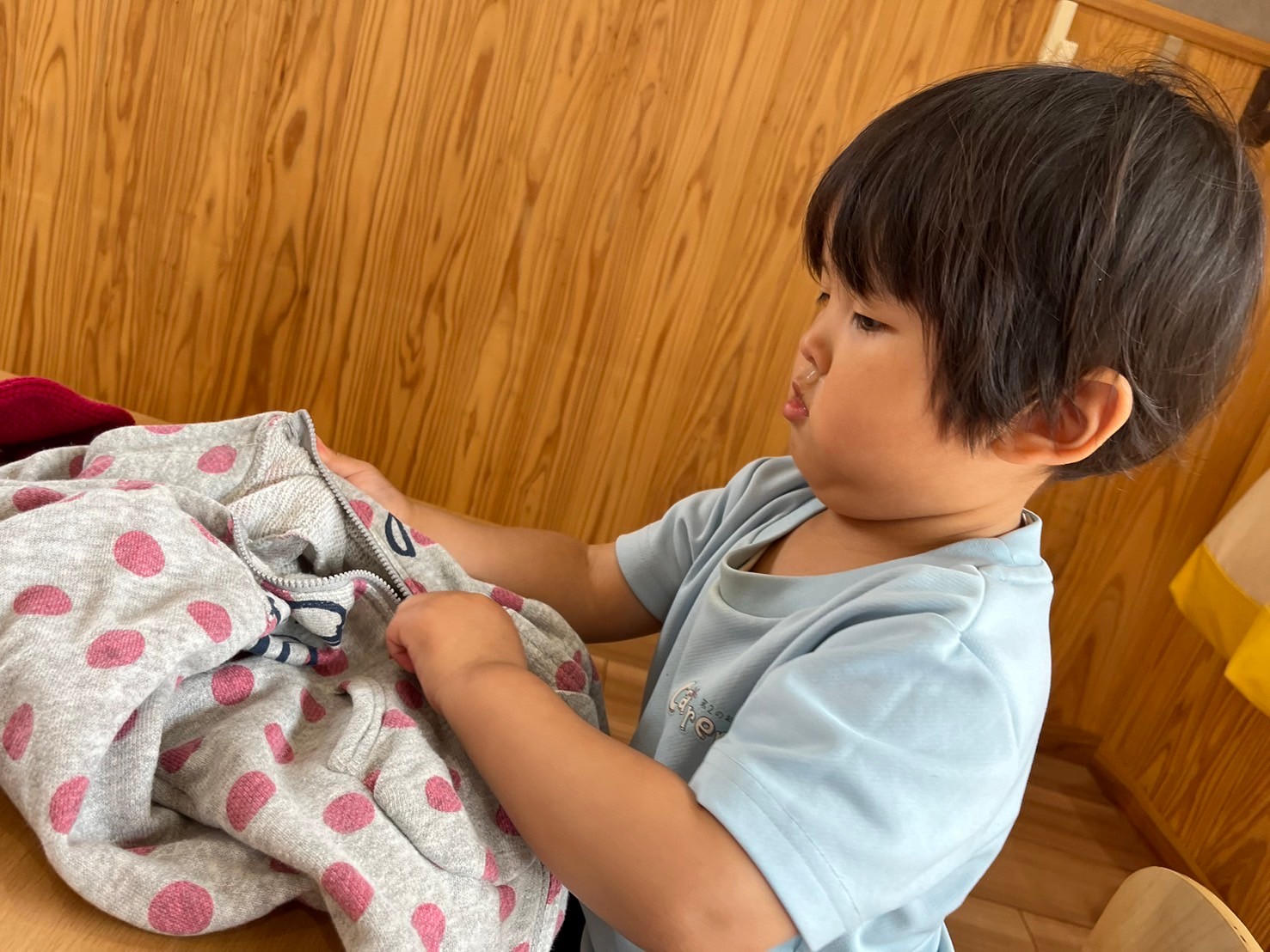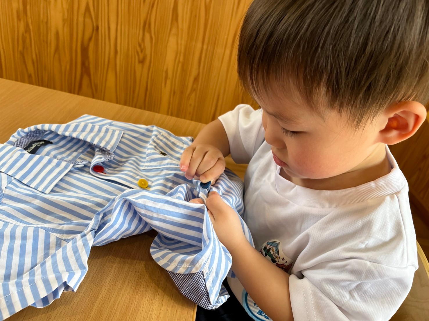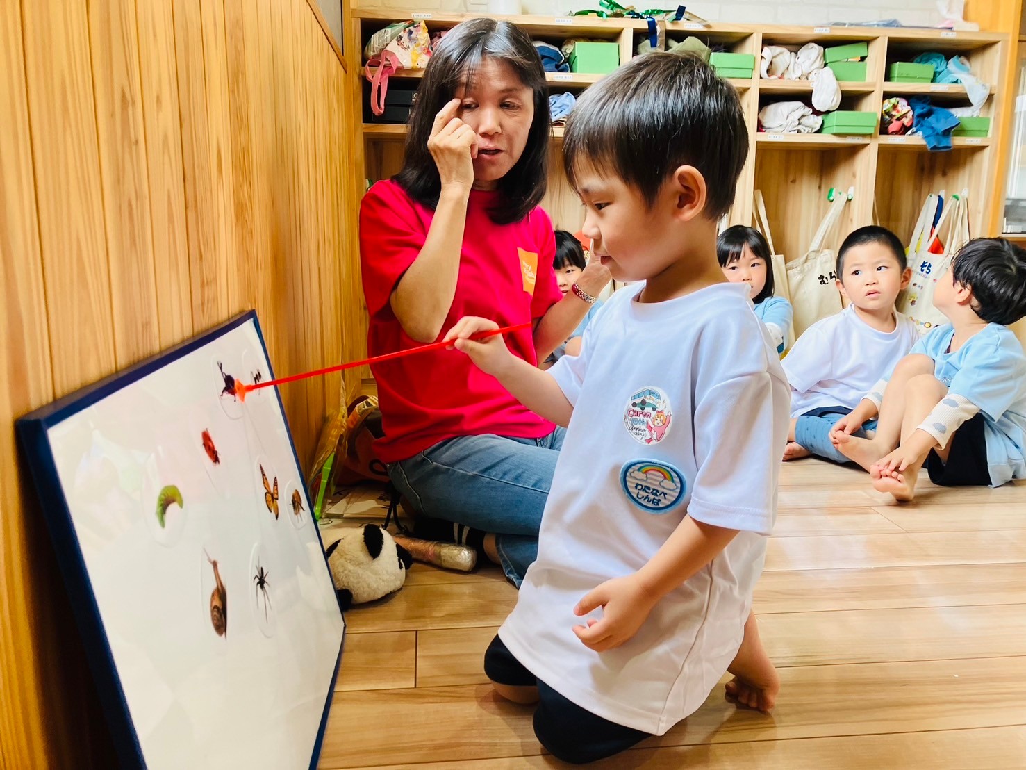 今日は楽しみにしていた英語教室でした🎶天気を確認する時「No!」が言えたり、Yesが「まる〜」と日本語になったりと楽しそうでした🤣前回と同じ昆虫の単語から、先生が言った昆虫をボードから探すと言う遊びで探すのに必死なぱんださんたちでした🐼💗その後トミカで遊びながら、ボタンとチャックの練習をしました🙌🏻ボタンの取り方付け方、チャックの開け閉めを難しながら頑張って練習していましたよ🤭✨うさぎ、こあら、きりん組