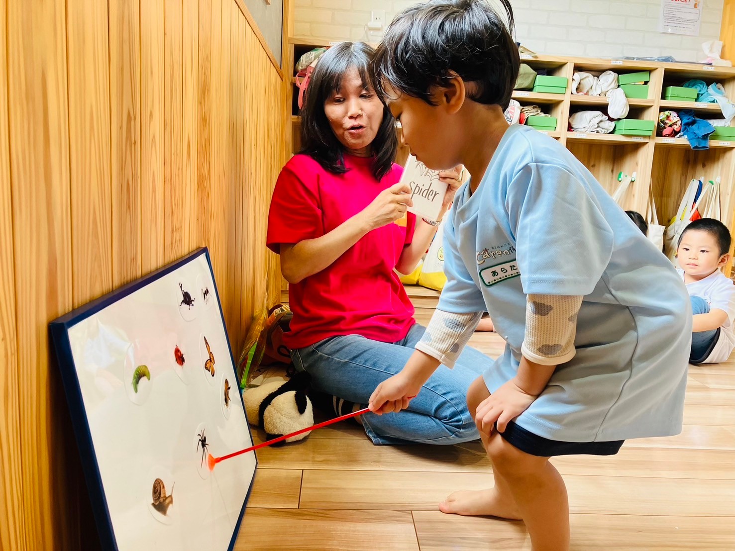 講師が提示した昆虫カードを英語で答え、吸盤がついた棒で昆虫カードをゲットするゲームに目を輝かせる子ども達🥹