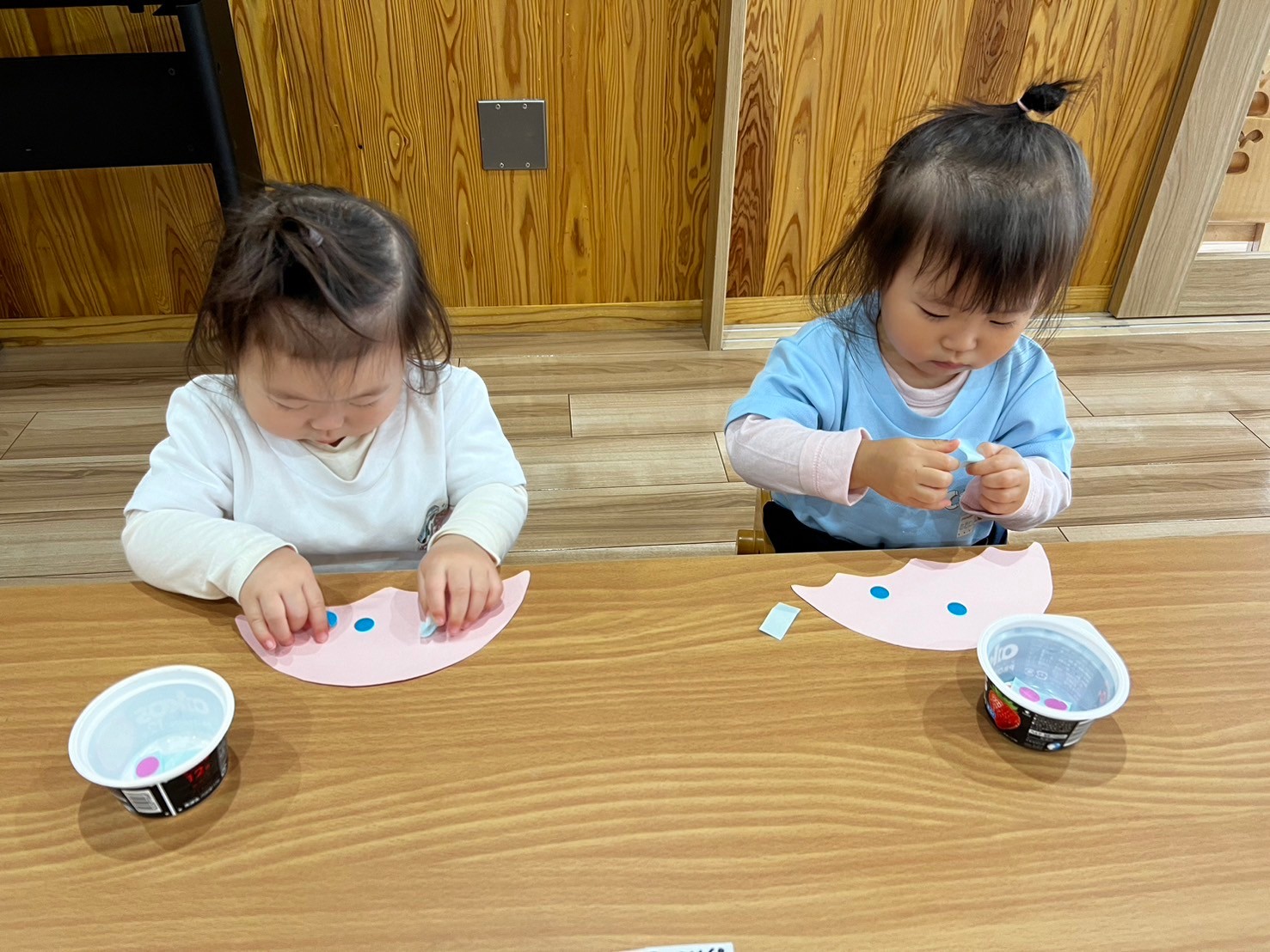 音をよく聞いて、ぱっと反応できるようになってきたりす組さんです👏 その後は月製作のシール遊びをしたり、粘土遊びをしたりしました🤭💕 上手にころころと転がしてへびさんを作ったり先生から作ってもらったソフトクリームをもらい、にこにこ笑顔のお友達☺️歌を歌って楽しい時間になりましたよ🎶✨️ぱんだ組🐼