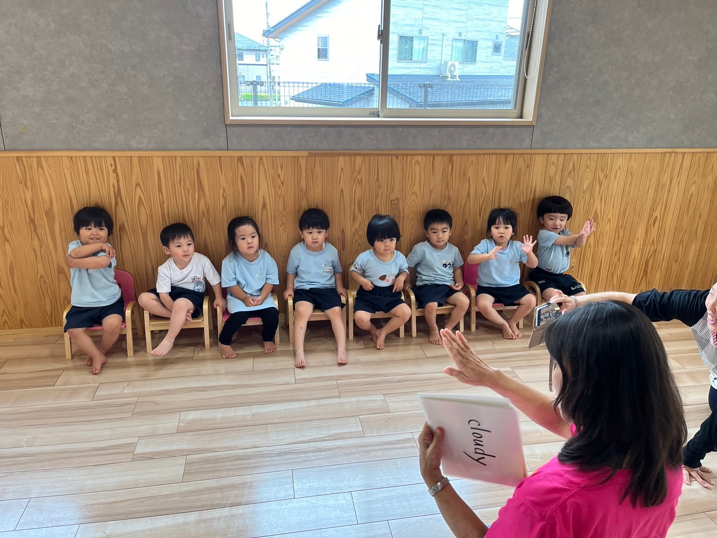 アルファベットやフォニックスを一緒にリピートしたり、天気の問いに答えましたよ(天気)