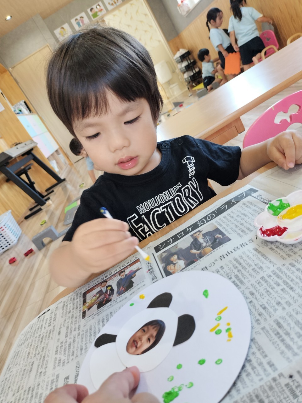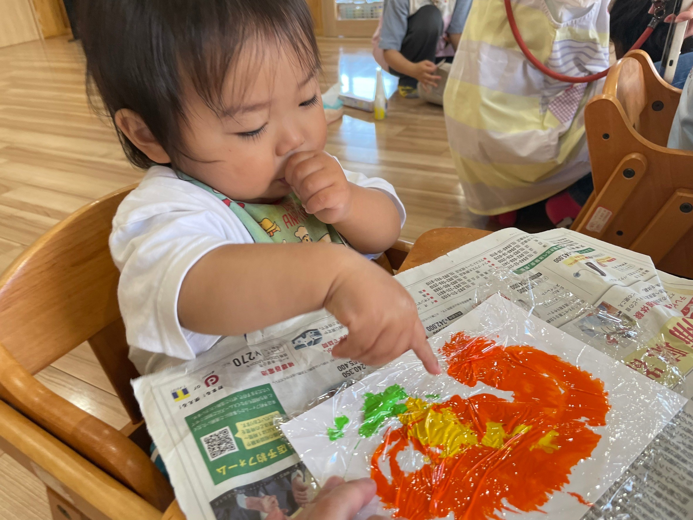 保育者が出す色とりどりの絵の具に興味津々のお友達💕