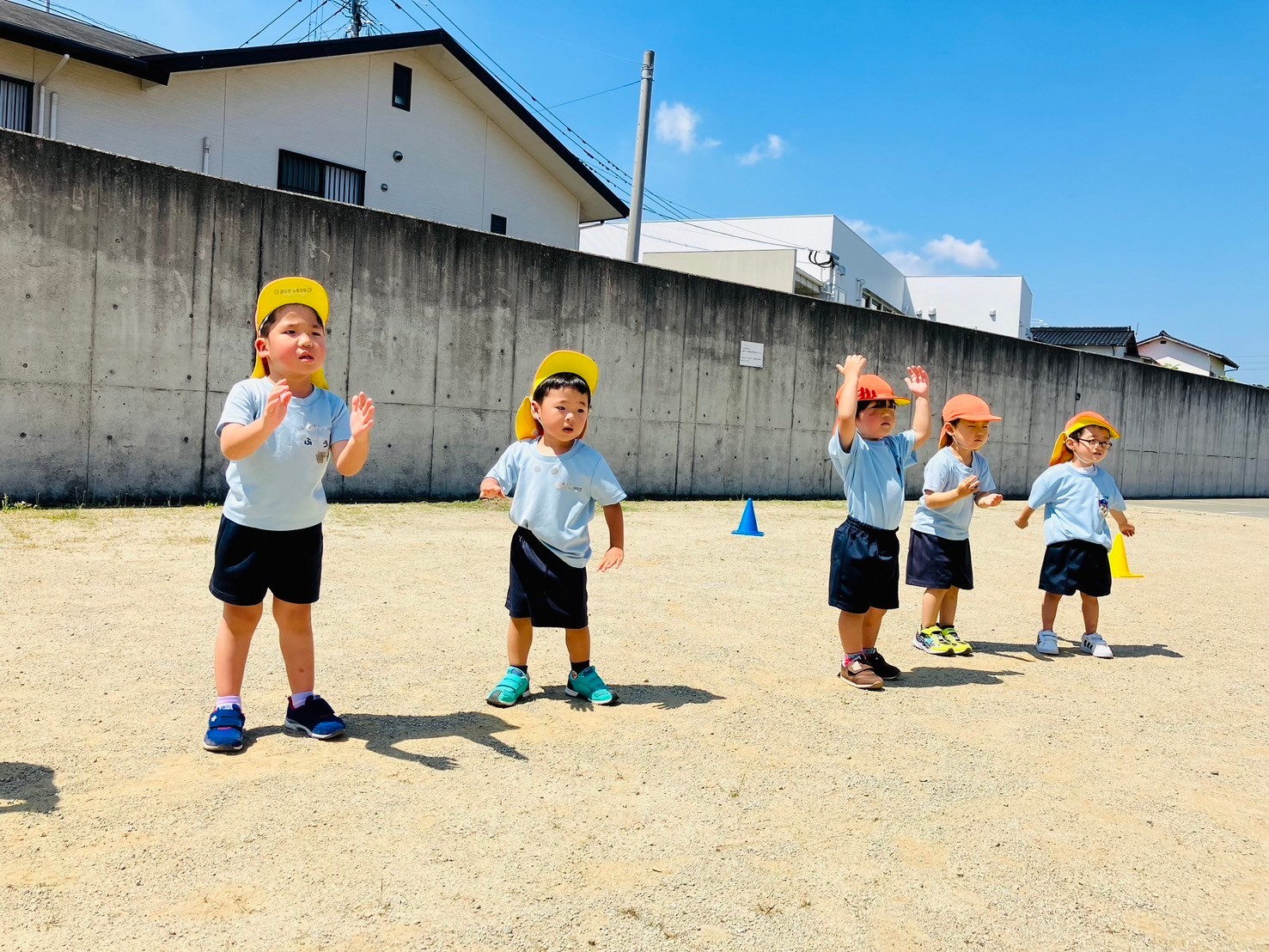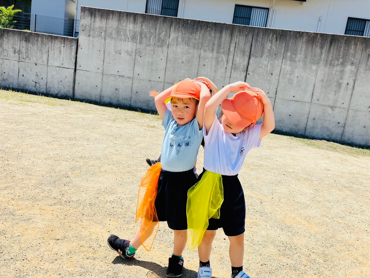 初めてのグラウンド練習に少し緊張気味でしたが、保育者と一緒に楽しく踊ったうさぎ組さんでした☺️