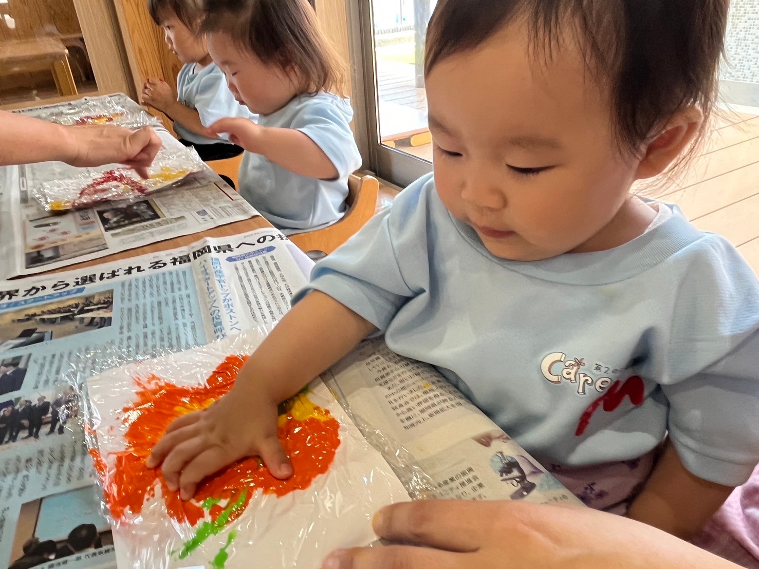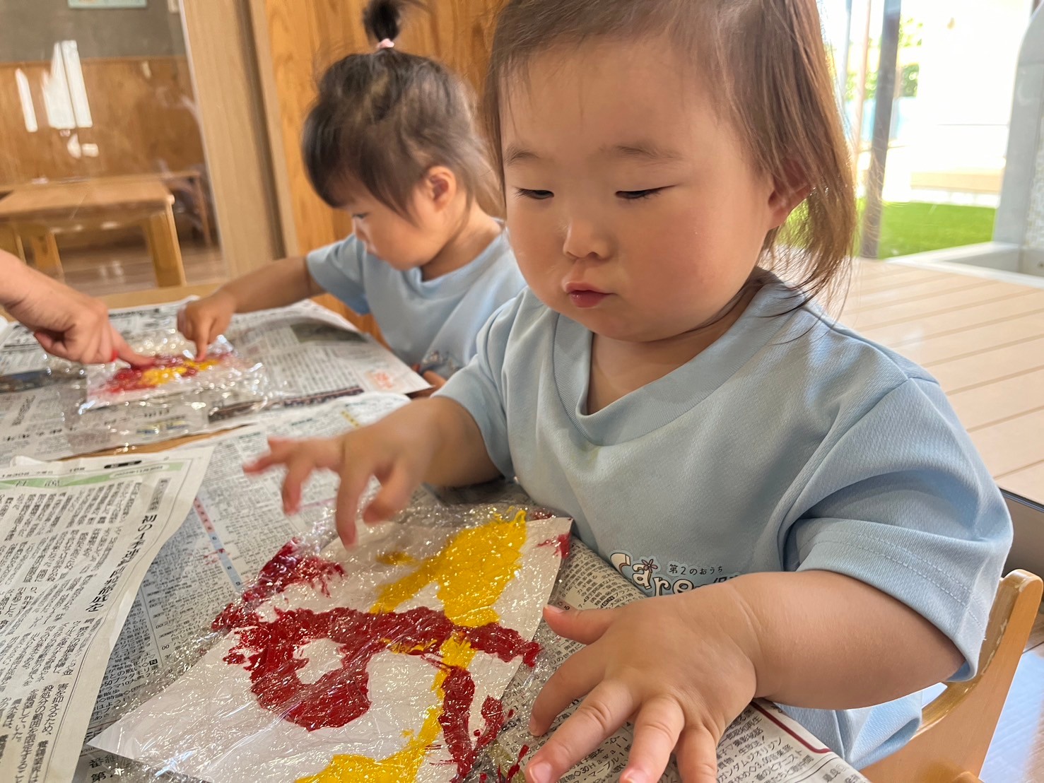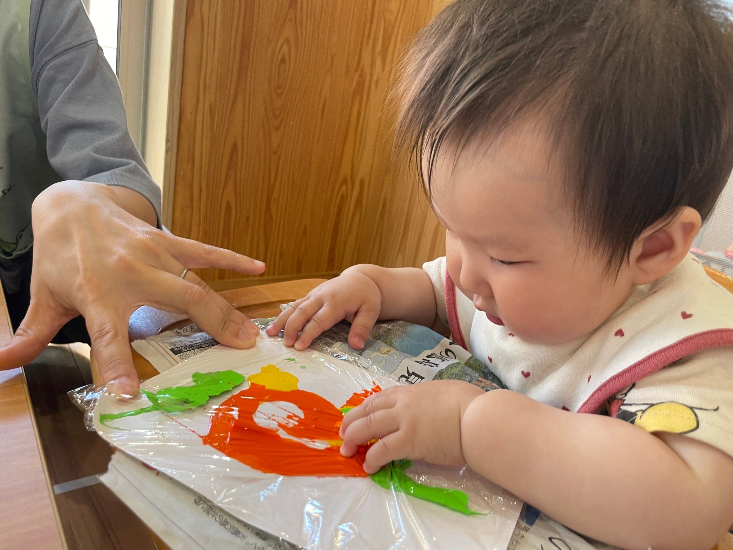 絵の具遊びでは、絵の具の上にラップを被せ感触遊びとして楽しみました🥺