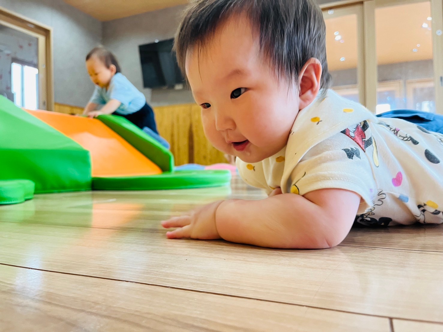 ハイハイのお友達もお部屋の探索や先生と一緒に滑り台を楽しみましたよ🩷ぱんだぐみ