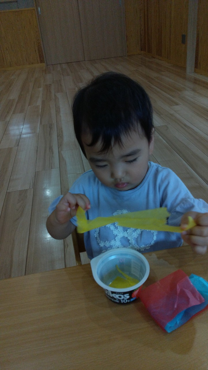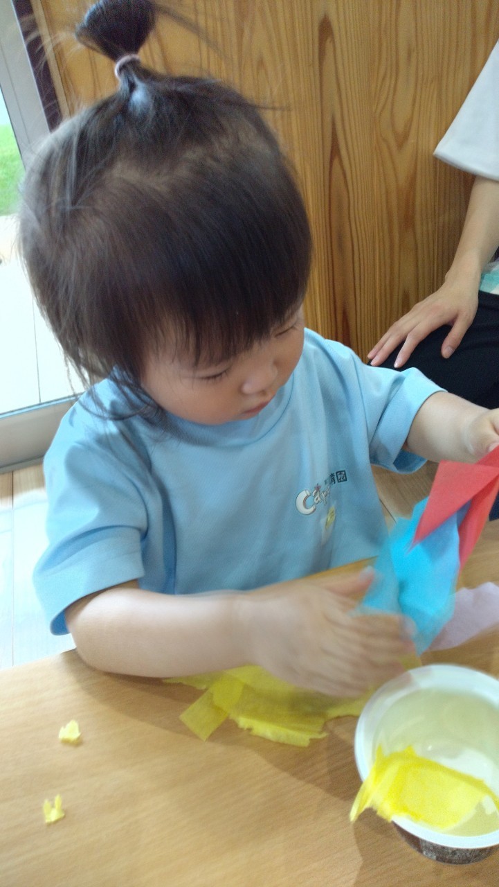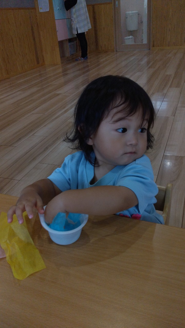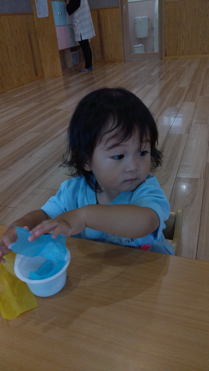 花紙をビリビリとちぎりカップに入れ、糊を塗った画用紙にペタペタと貼っていきました😃