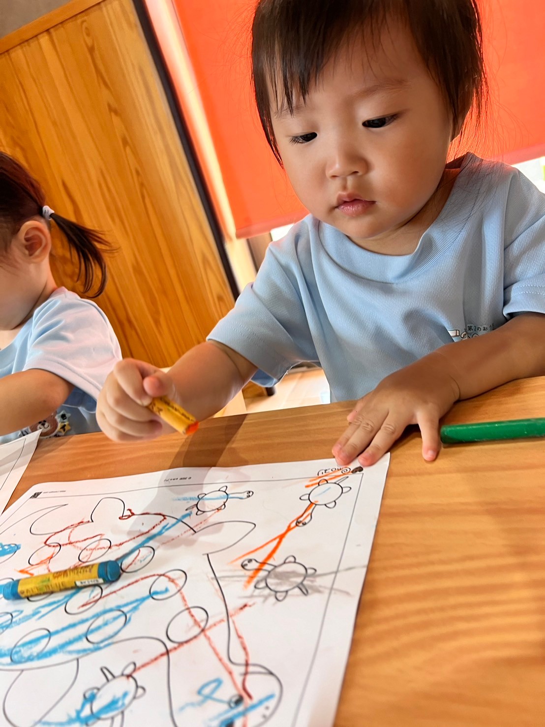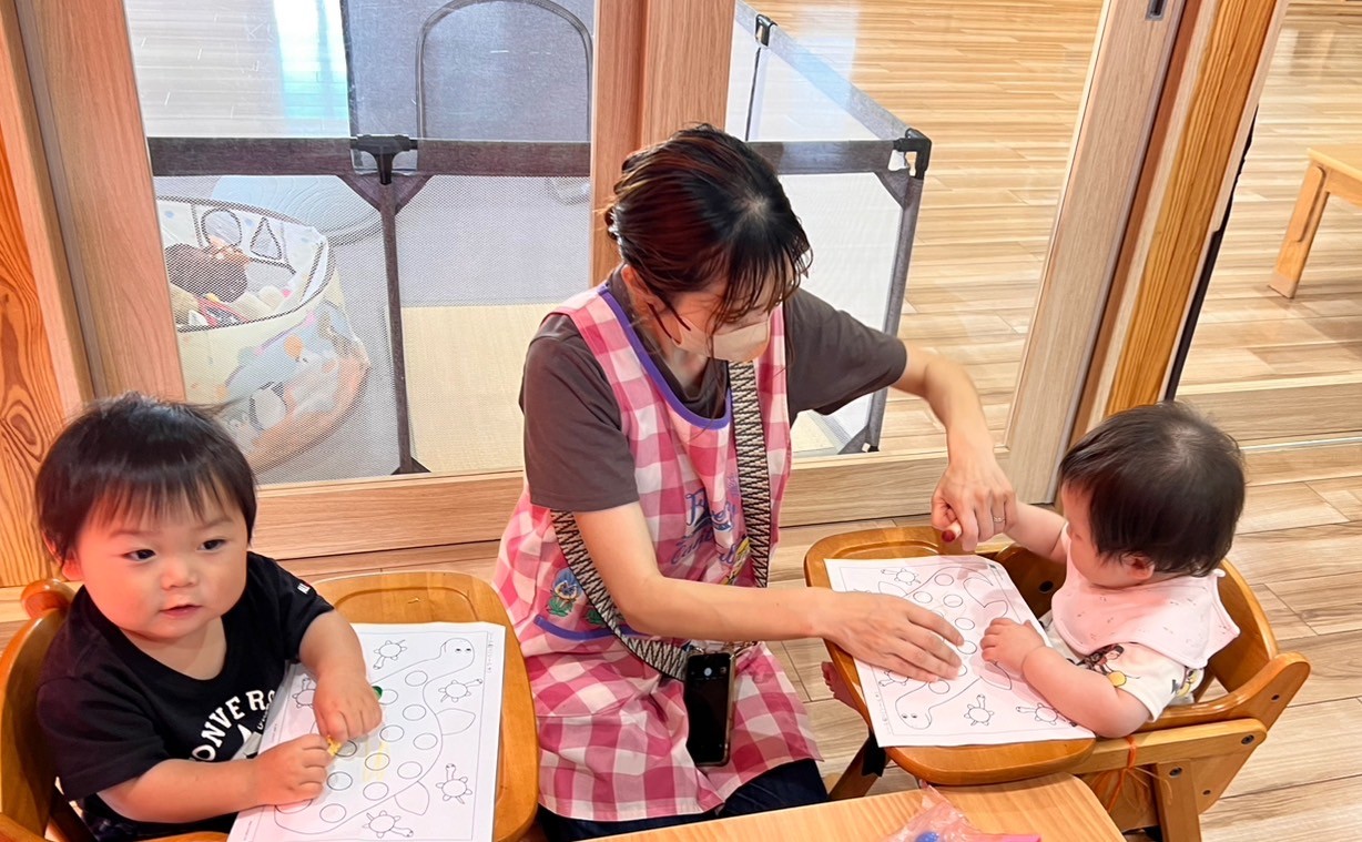 今日はお部屋でお絵描きとシール貼りをしました🎨✍💕 2種類準備した用紙の中から好きな方を選びクレヨンを使ってお絵描きをしましたよ☺️ 思い思いにじのじのとクレヨンをすべらせていました🖍シール貼りも上手に出来ましたよ🎶その後はひよこ組さんのお部屋に行きボール遊びをしましたが外で楽しそうに水遊びをするお兄さん達にみんな釘付けでした🤣💖 窓のところに水をかけてもらいにこにこと嬉しそうでしたよ🥰