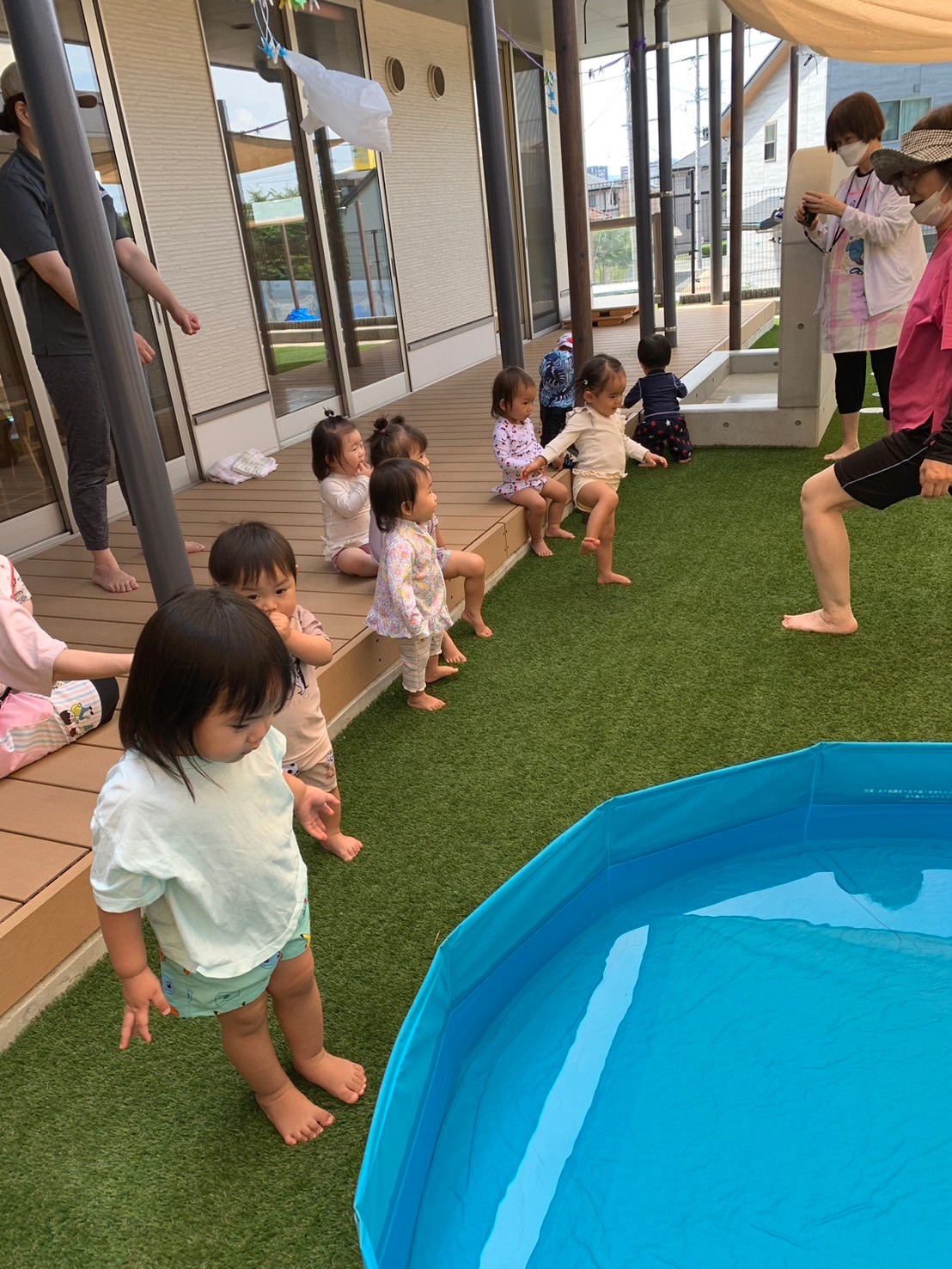 今日は今年初めてのプール遊びの日でした😄登園すると園庭にプールが見えて気になる様子のお友だち😍