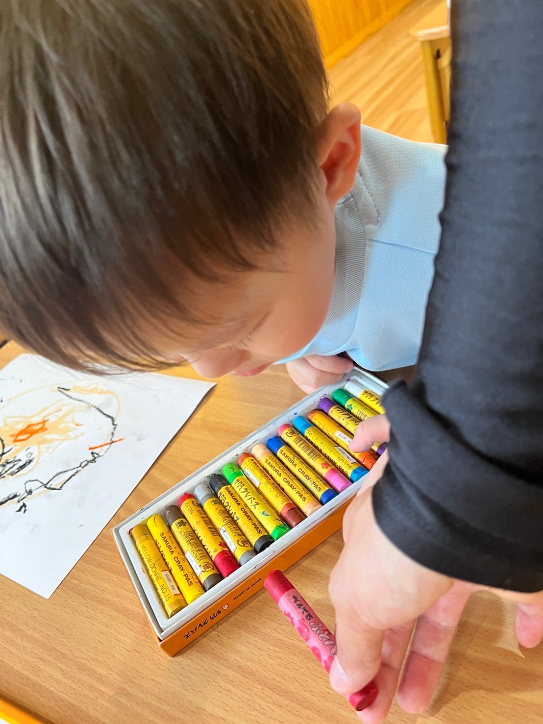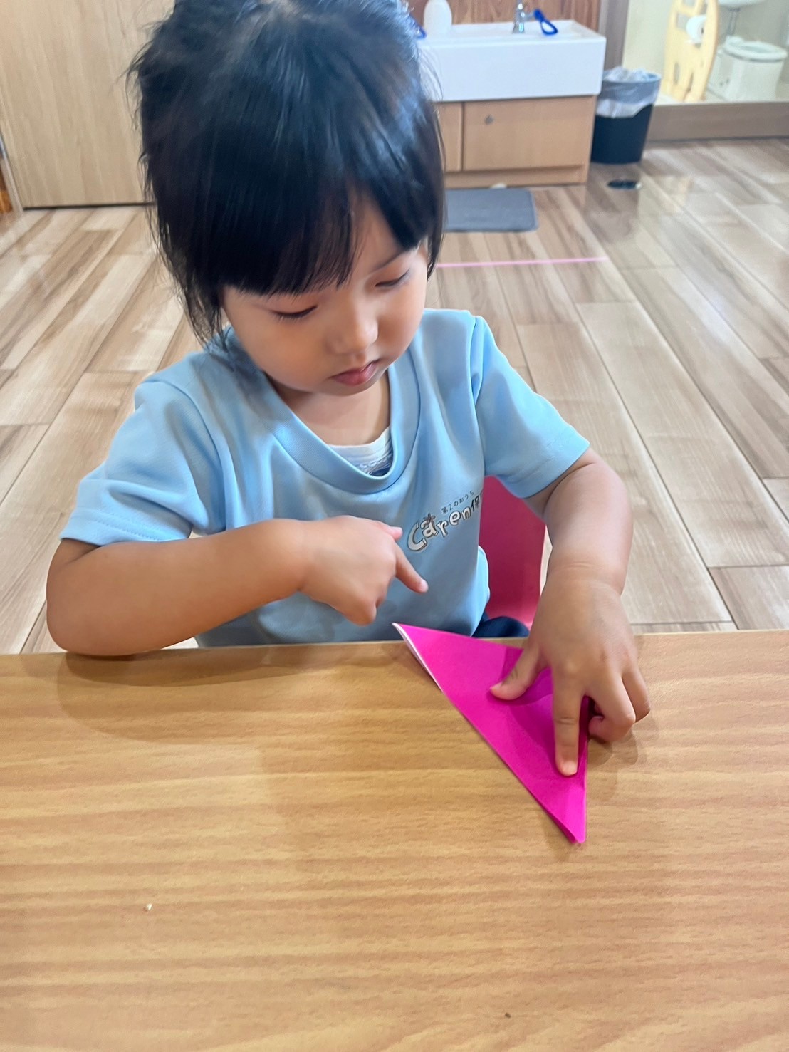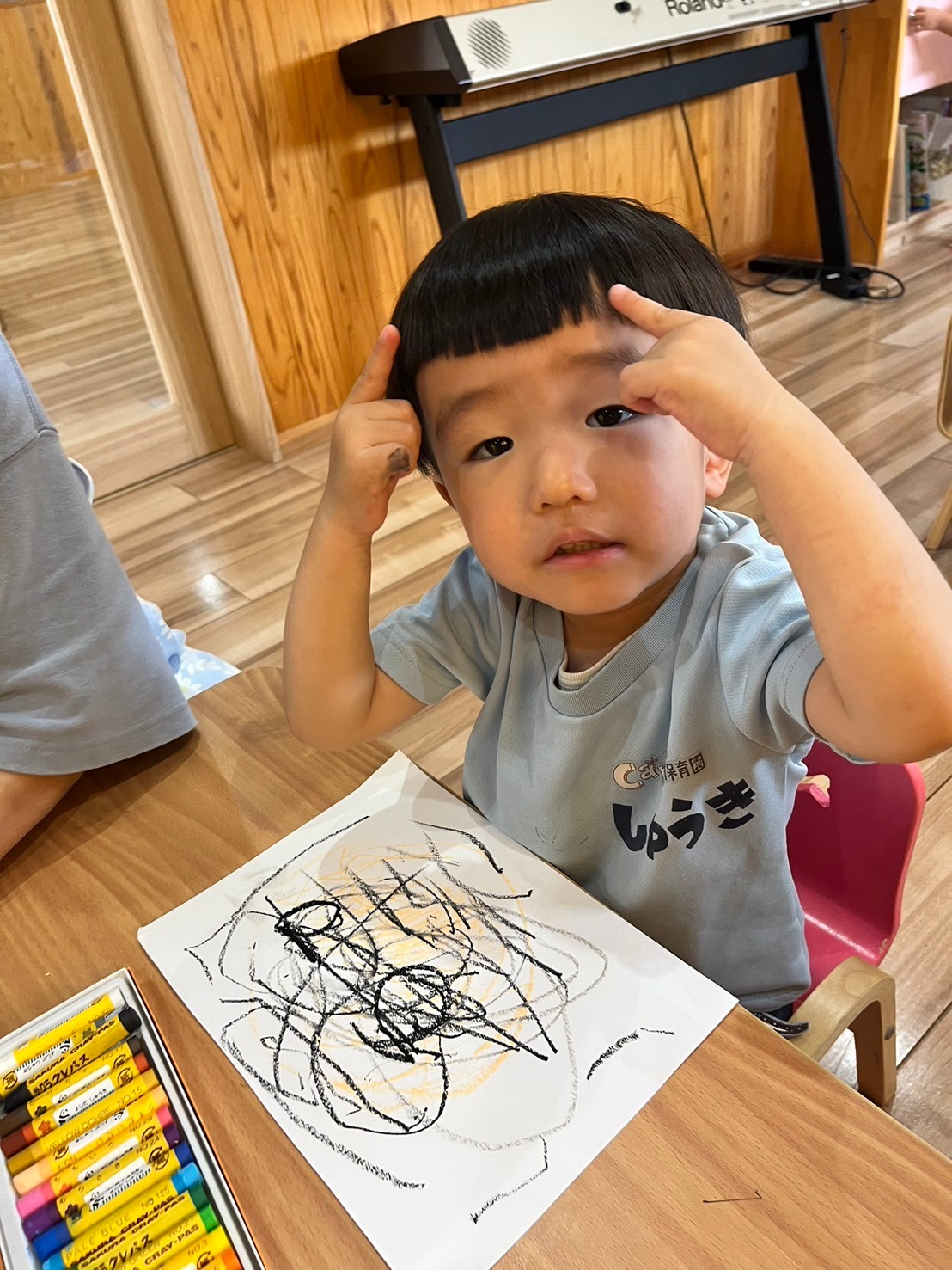 今日は折り紙遊びで基本の三角、四角折りを保育者と一緒に折りました🥰保育者の説明を聞いて上手に折る子や自由に折る子がいました🤣💕その後似顔絵を描く練習もしました🖍️輪郭や髪の毛など1つずつ描き進めて、目や鼻が何個あるのかをみんなで話したり触って確かめて描くことができました🥰他にもポットン落としや型はめパズルを集中して遊ぶことができました🧡うさぎ、こあら、きりん組