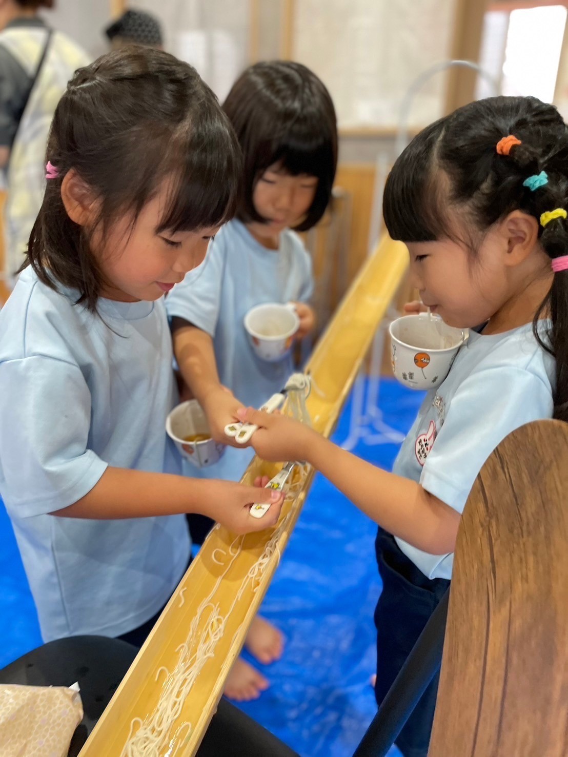 大きな竹に圧倒される子もいましたがいざ、水やそうめんが流れてくると嬉しそうにフォーク🍴ですくって食べていました🥰みんな、そうめんをすくった後、つゆをつけるのがとっても上手でしたよ💕