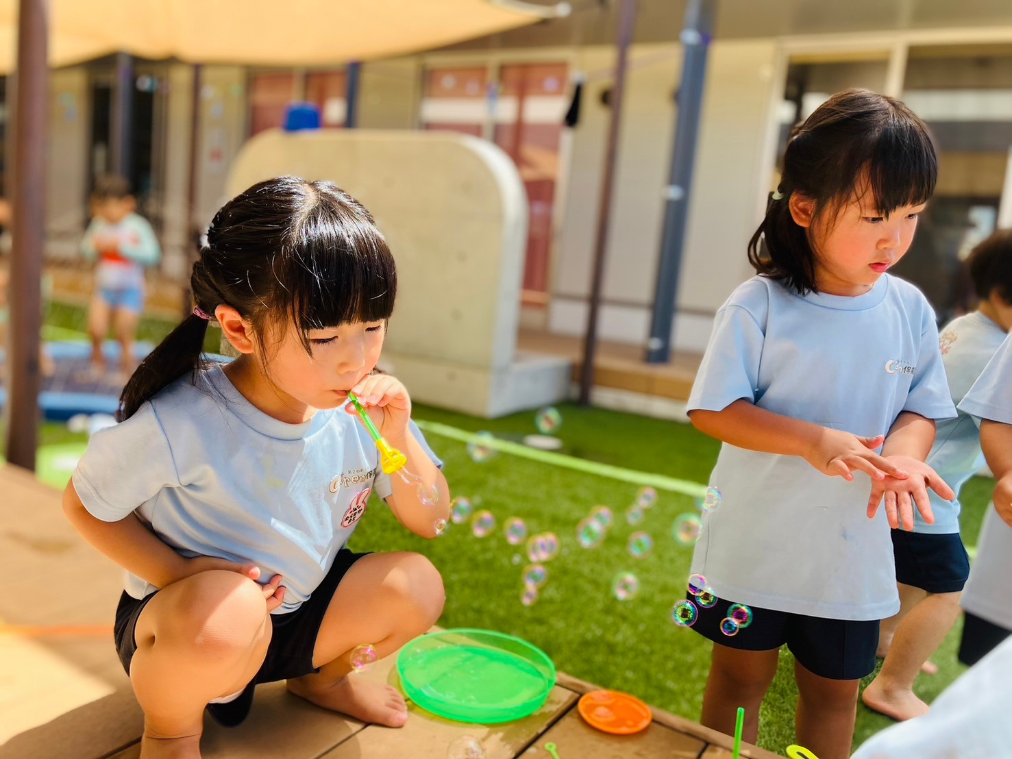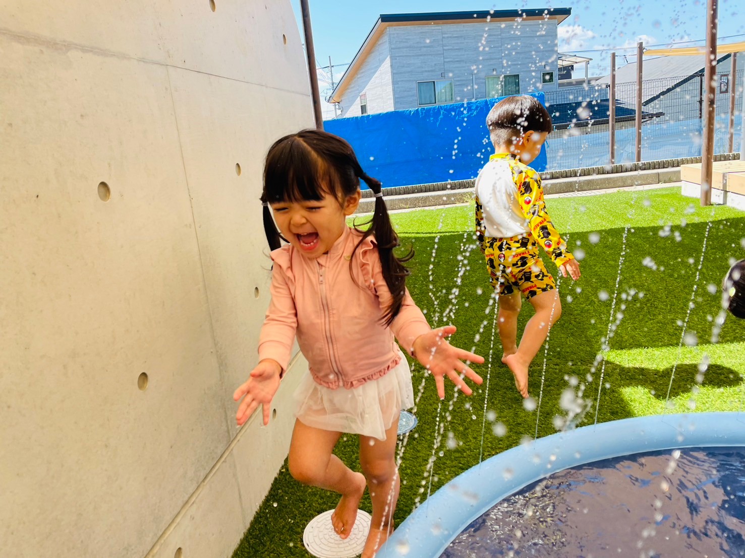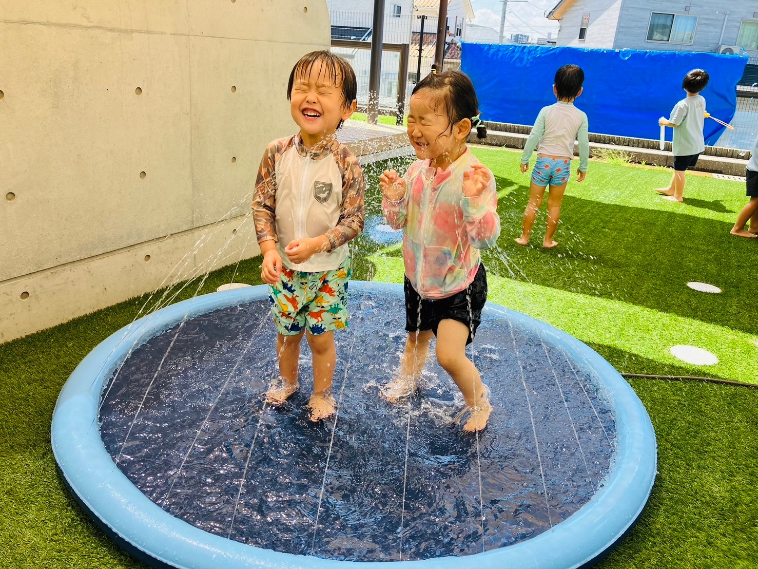 準備運動をしっかりして、水をかぶったり噴水の中に入ったりと思い切り水遊びを楽しみ、たくさんの笑顔が見られました🌼うさぎ、こあら、きりん組