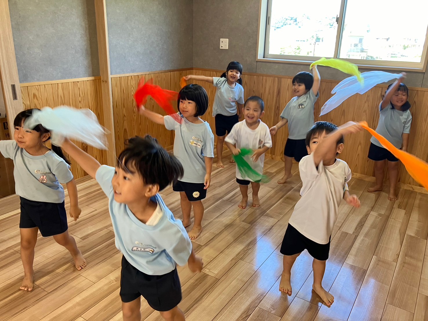 こあら、きりん組は音当てゲームや、音符カード、スカーフを使って身体全身を使って踊りを楽しみましたよ😁その後は水遊びやシャボン玉遊びを楽しんだ子ども達でした😆✨