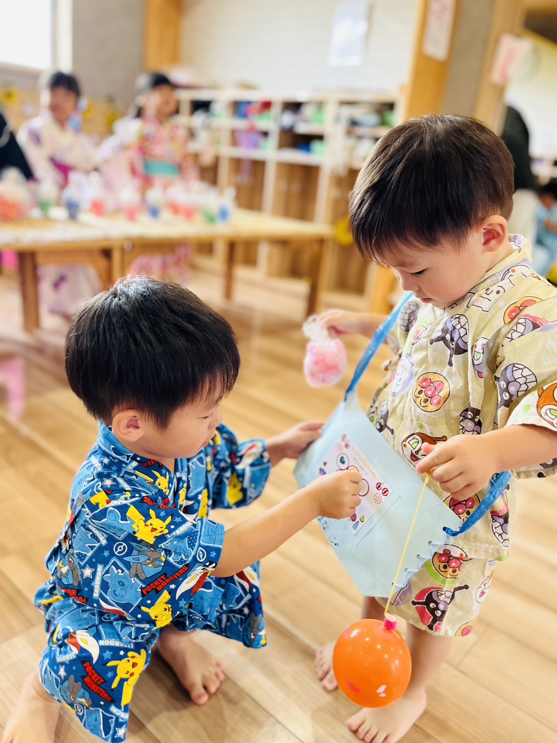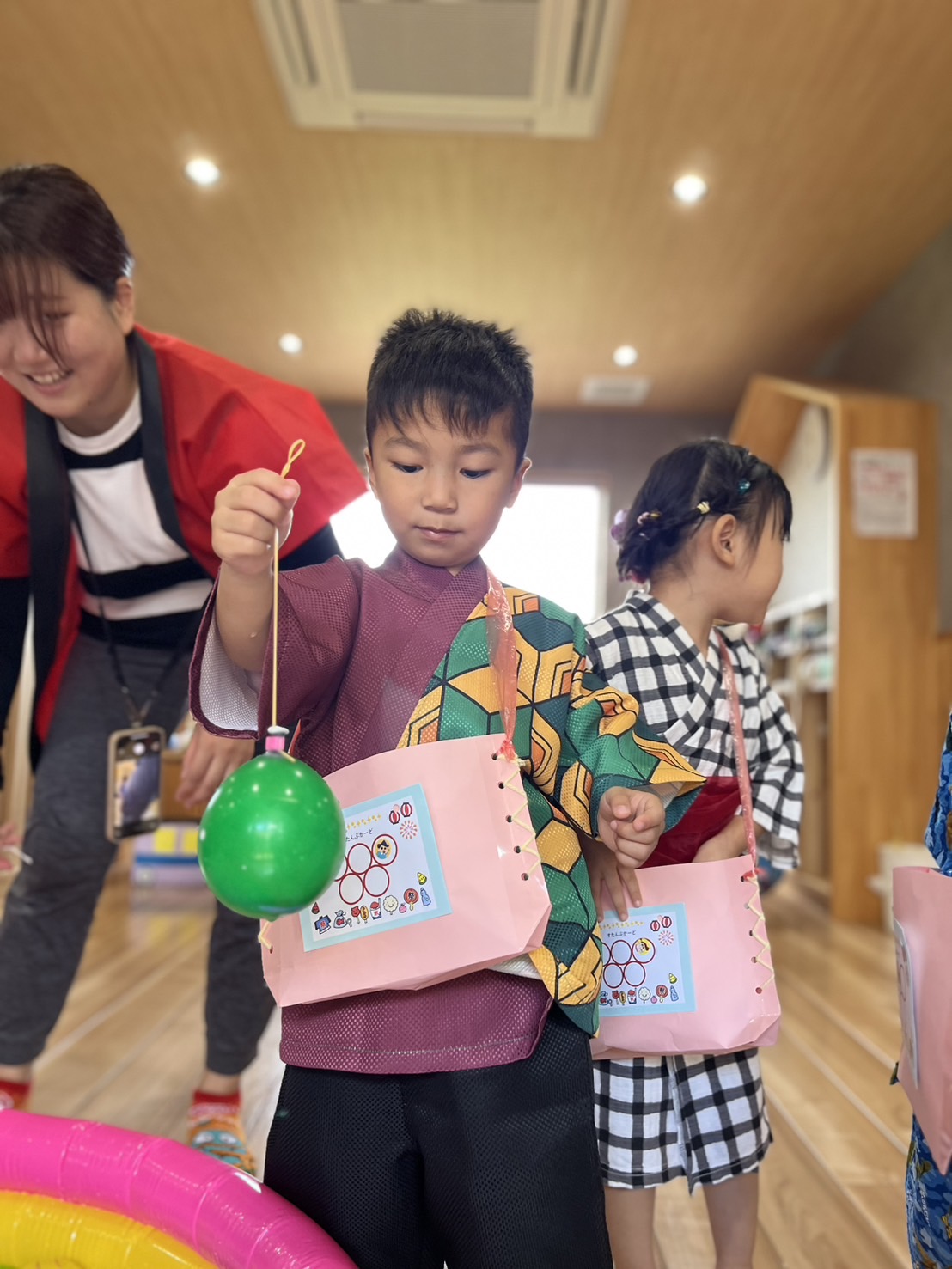 夏祭りでは先生や以上児さんのお手伝いをしてもらいながら色んなブースを回りたのしく参加しましたよ💕バックにたくさんのおみやげが入り嬉しそうな子ども達でした♡ぱんだ組🐼