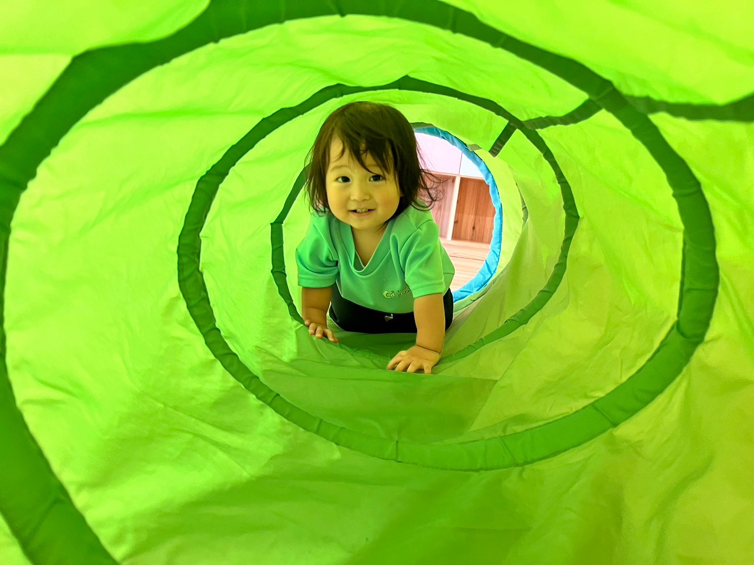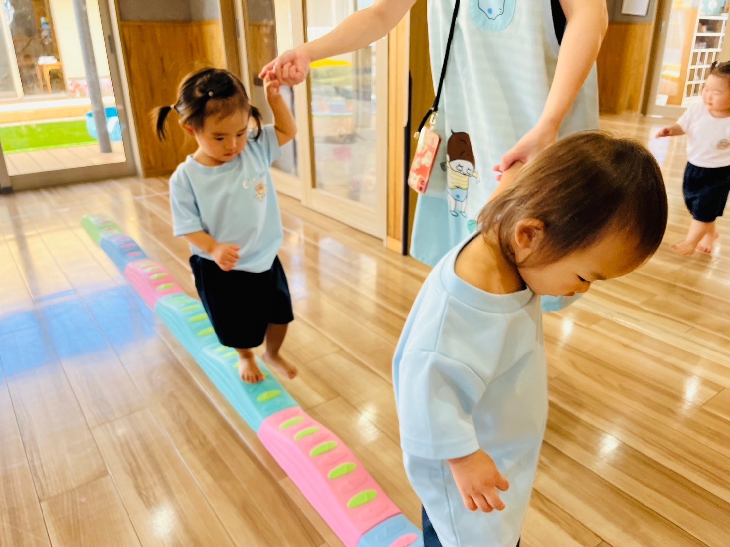サーキット遊びでは、鉄棒、滑り台、トンネルなど色々出して2つのお部屋を使って遊びました!好きな遊びに向かう子ども達で