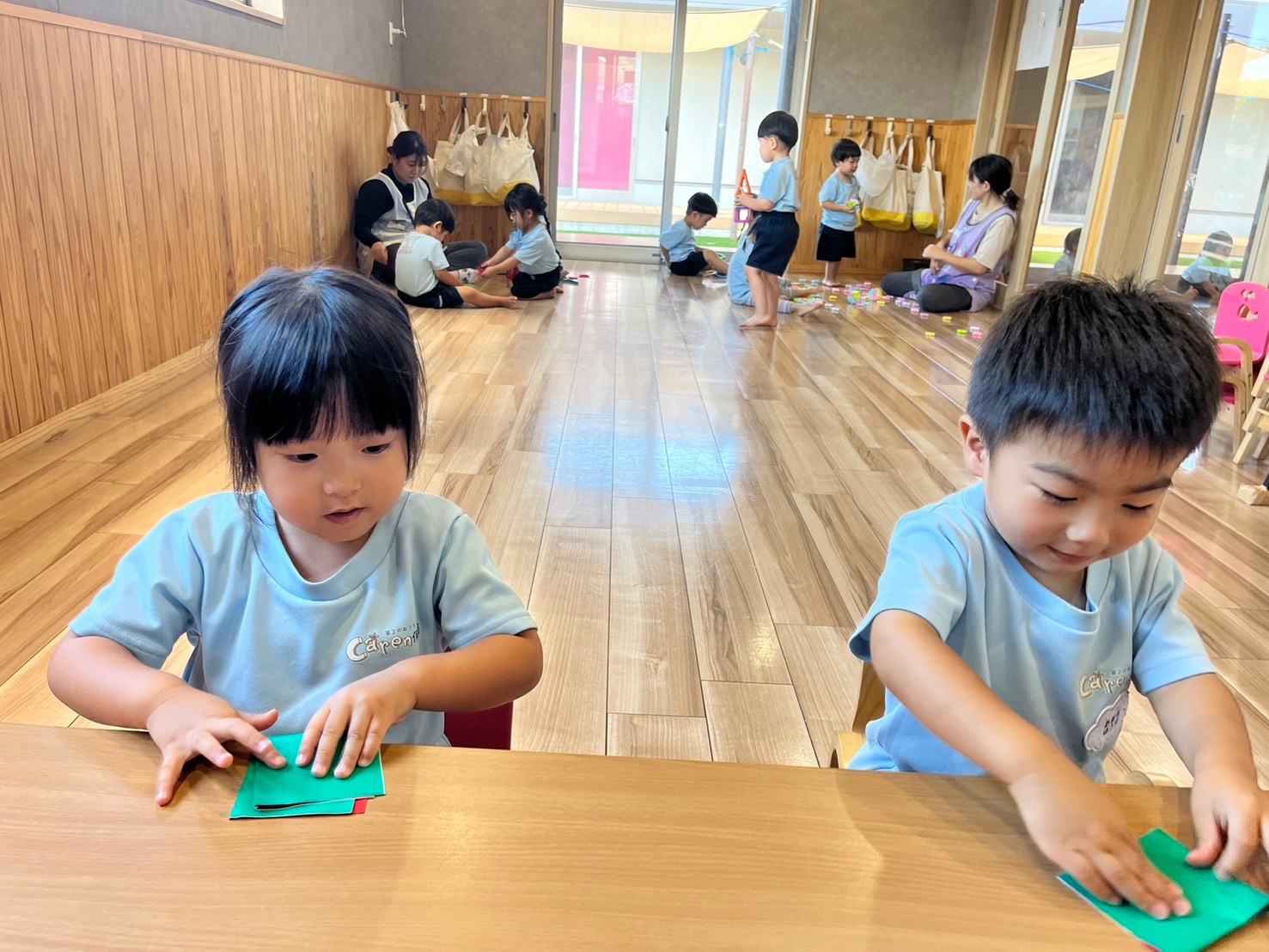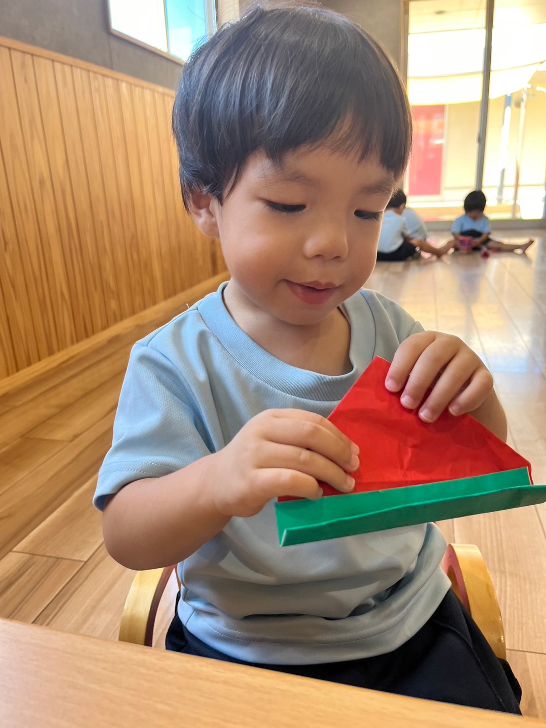 月製作でスイカを折りました🍉❣️両面色のついた折り紙に興味津々で保育者と一緒に折り進めていき、種の模様をペンでちょんちょん🎶描きました🥰