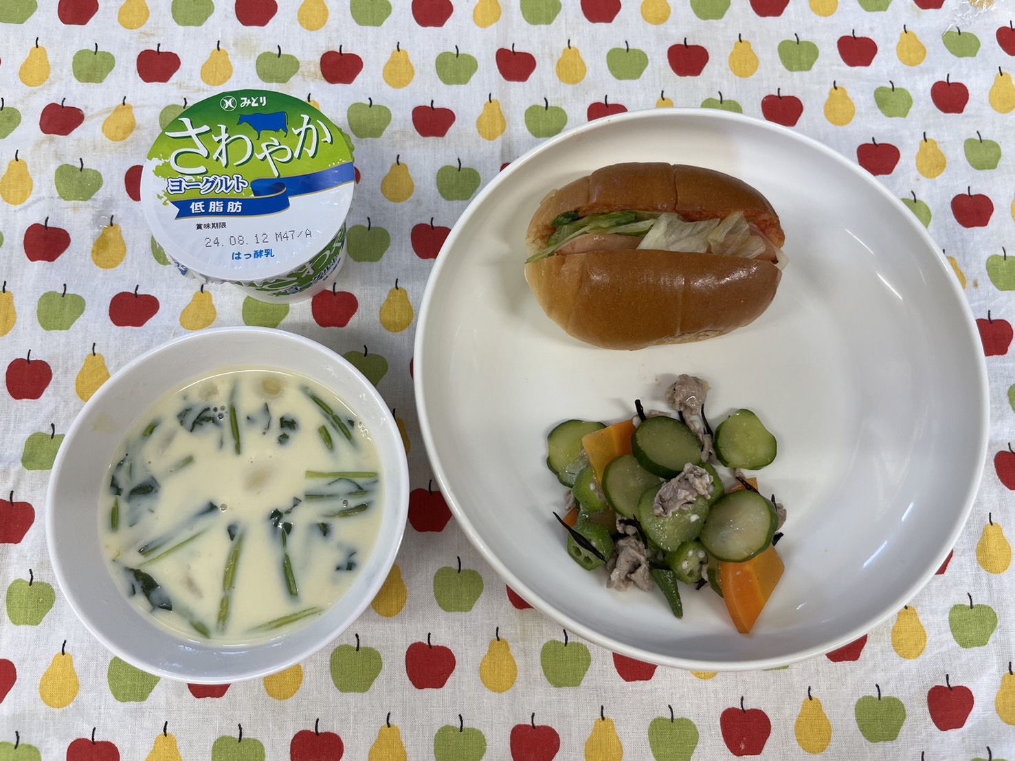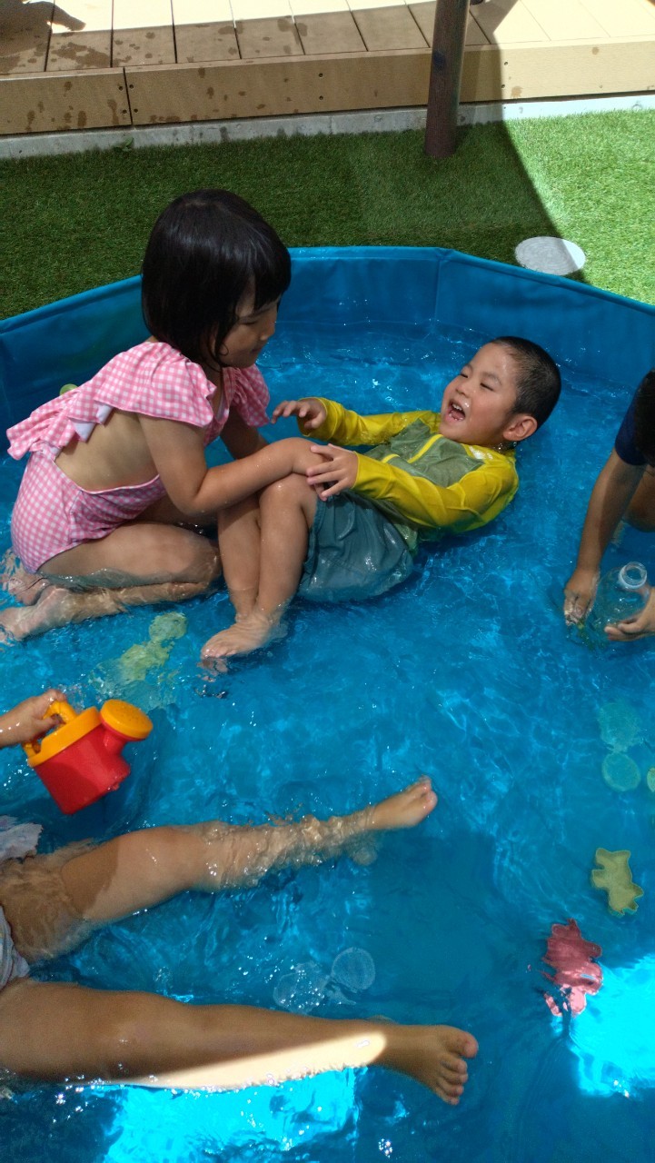 今日は英語教室の日でした✨英語の歌遊びやfishingゲームもノリノリで楽しんでいました😄フラッシュカードもどんどん答えてバッチリでしたよ✌️その後は水遊びをしました🌞水風船やシャワープールで思いっきり遊びました!😆途中からうさぎ組も仲間入りして水遊びを一緒に楽しみました😁✌️【くりえいと園の今日の給食です】