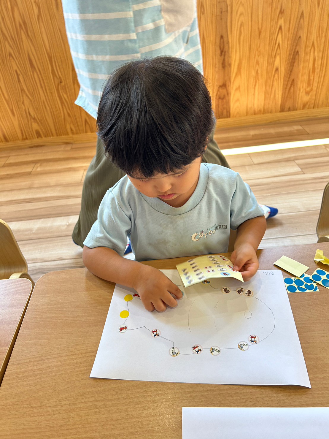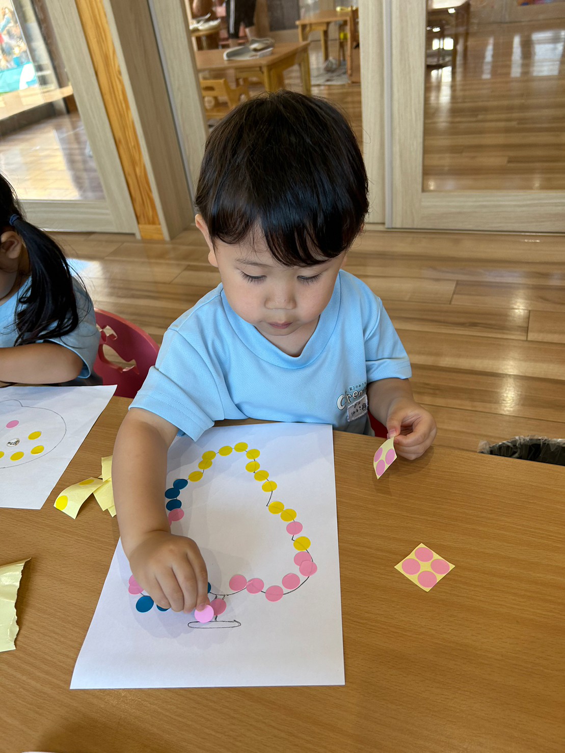 夏に因んだ茄子🍆と魚🐟と葡萄🍇の形にシールを貼っていきます。「線の上にシールを貼るよ」と話して始めた所、線にきちんと貼れる子が何人もいました🥰
