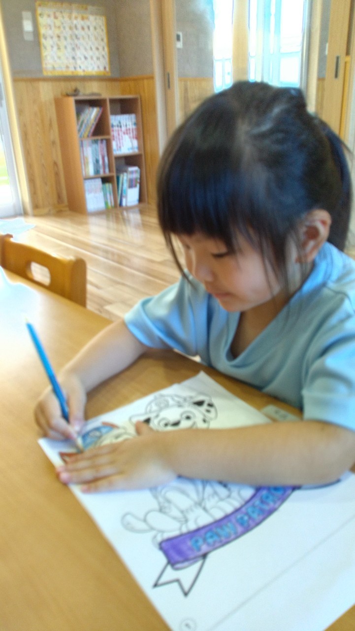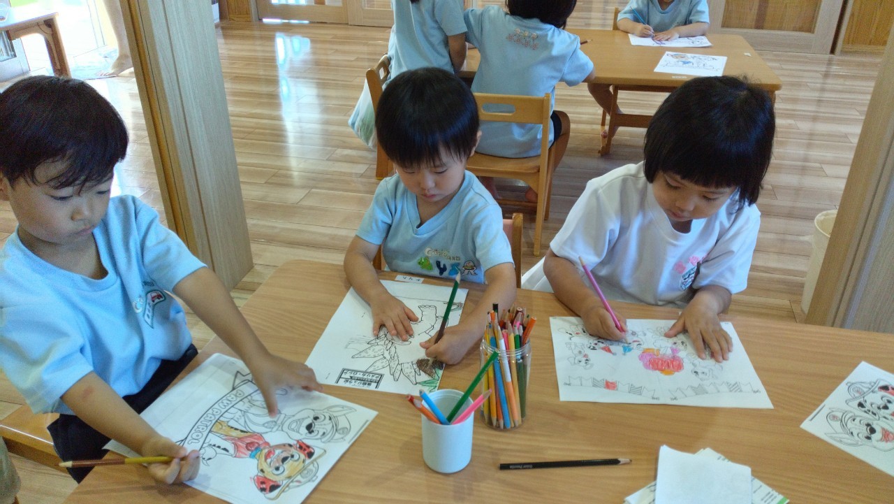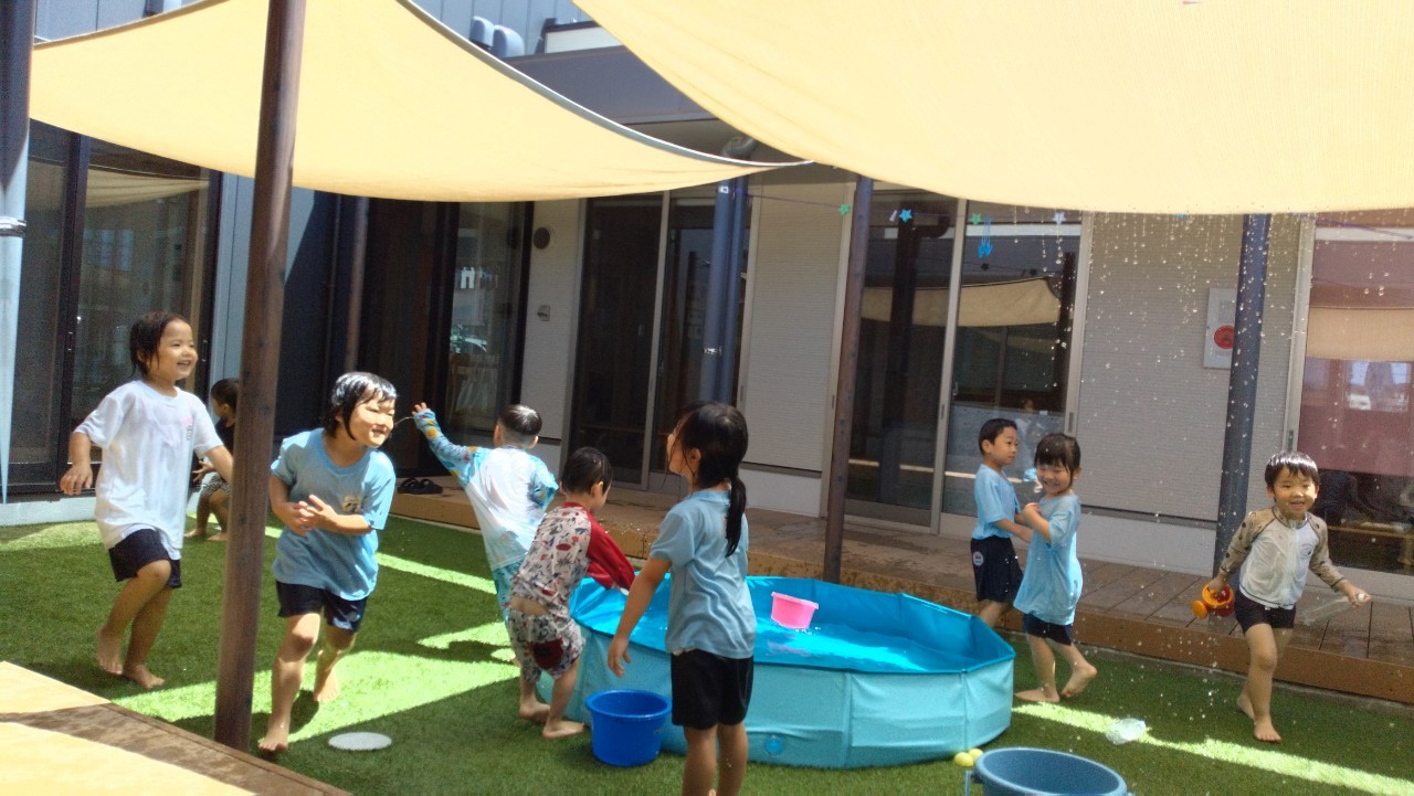 今日はうさぎ組は水遊びの日でした🌞プールにザブーン💦と入って水風船や玩具で水をかけたり元気いっぱい遊びました😆先生と一緒にプールの中で本当に心地よさそうで笑顔が弾けていましたよ💕こあら、きりん組はぬり絵をしました。好きなキャラクターなど絵柄を選んで色鉛筆タッチもしっかり塗り込んでいました✌️きれいにできると友だち同士で見せ合って満足気でした✨それから、うさぎ組の水遊びに合流しました。水風船やシャワー遊びをして水しぶきの中パワー全開でした😆✌️