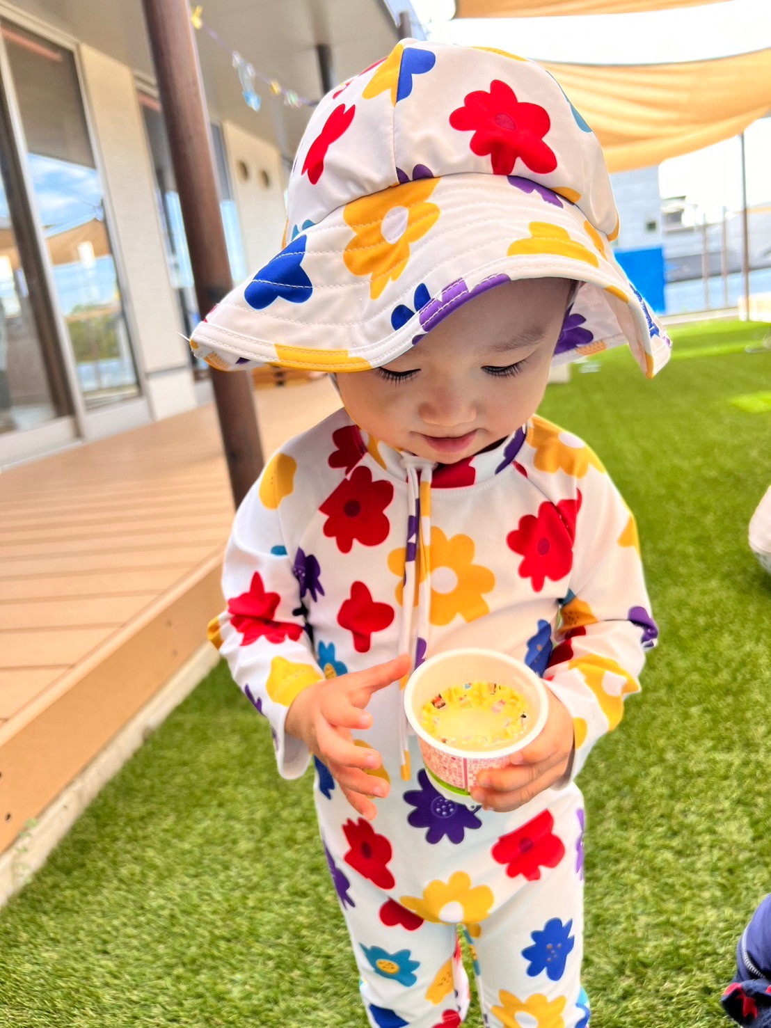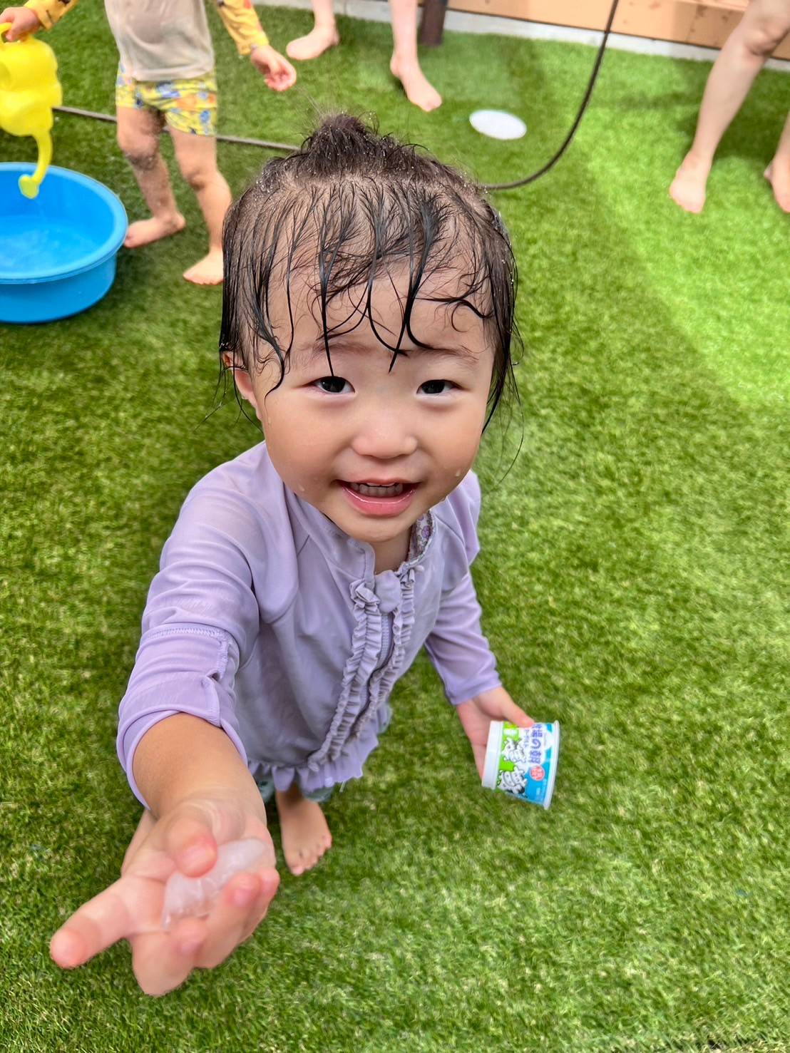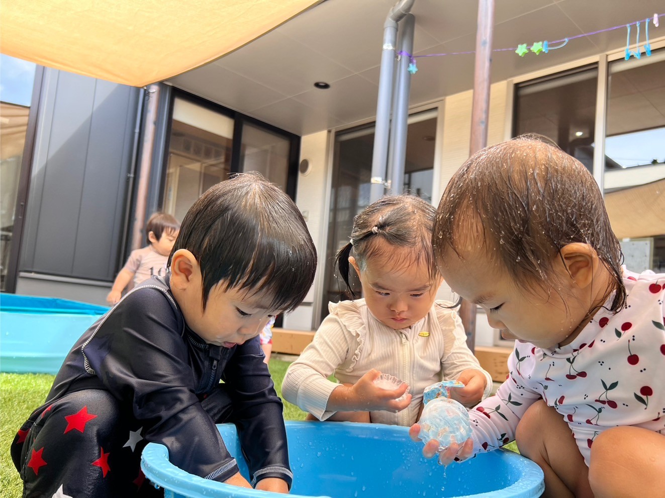 今日は久しぶりの水遊びの日でした🩵 氷も使って冷たい感触も楽しみましたよ😊 カップから外れたり溶けていく氷を見て不思議そうに見ながら遊ぶお友達、「つめたいー!」などとお話をしながらジョウロを使ったりシャワーも楽しみました🥰