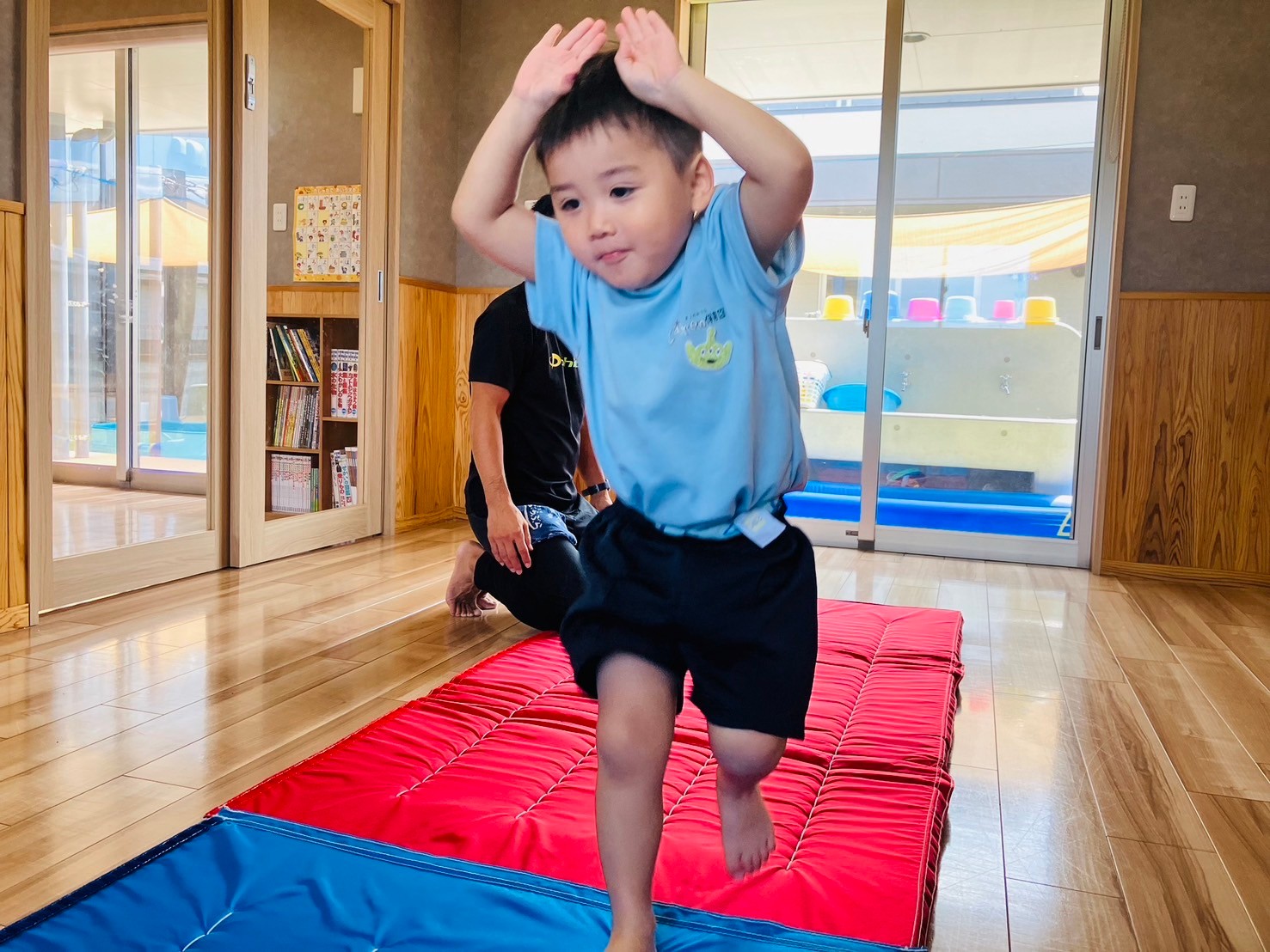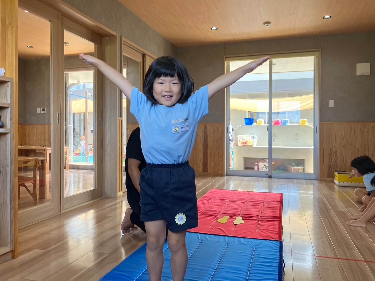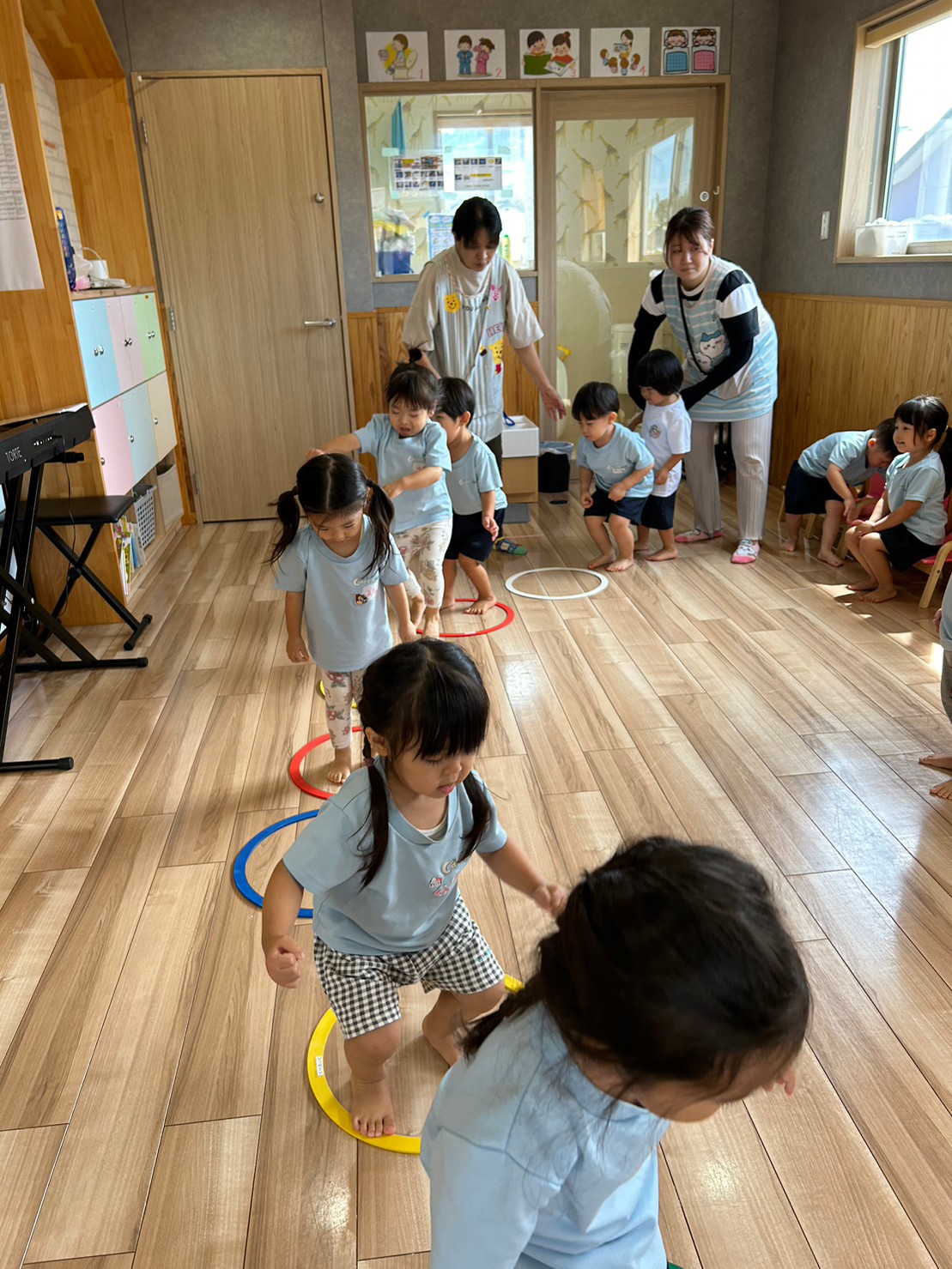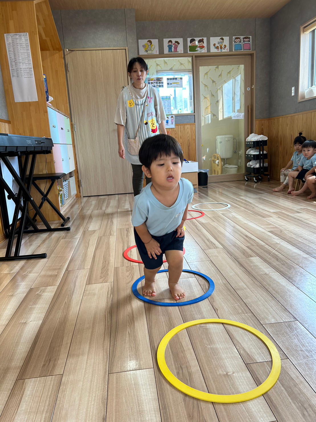 最初は片足になる子もいましたが、友達を見たり先生と一緒にしたりして要領を掴み皆リズミカルに跳べるようになり、最後は連なって進めるようにもなりました😍