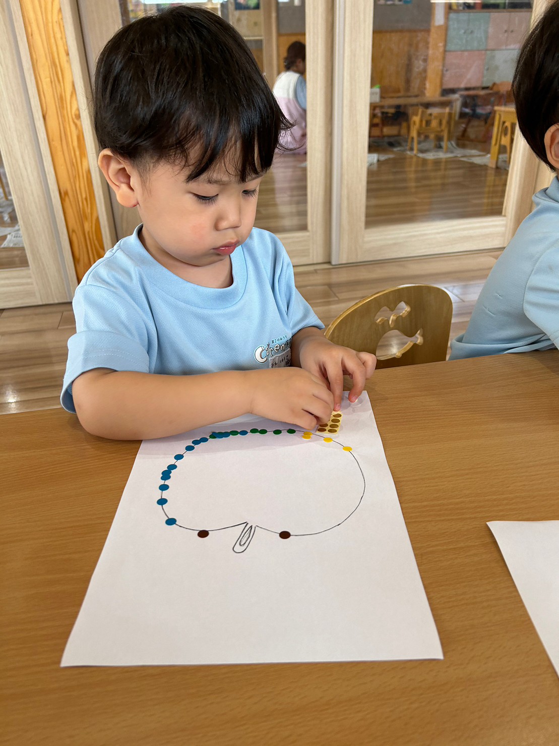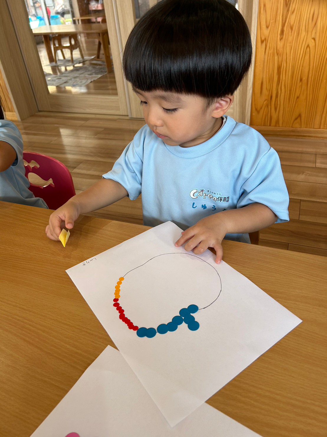 今日は小さなシールに挑戦する子もいて、線に沿って連なって貼ることができ、皆集中して最後まで頑張りました👏