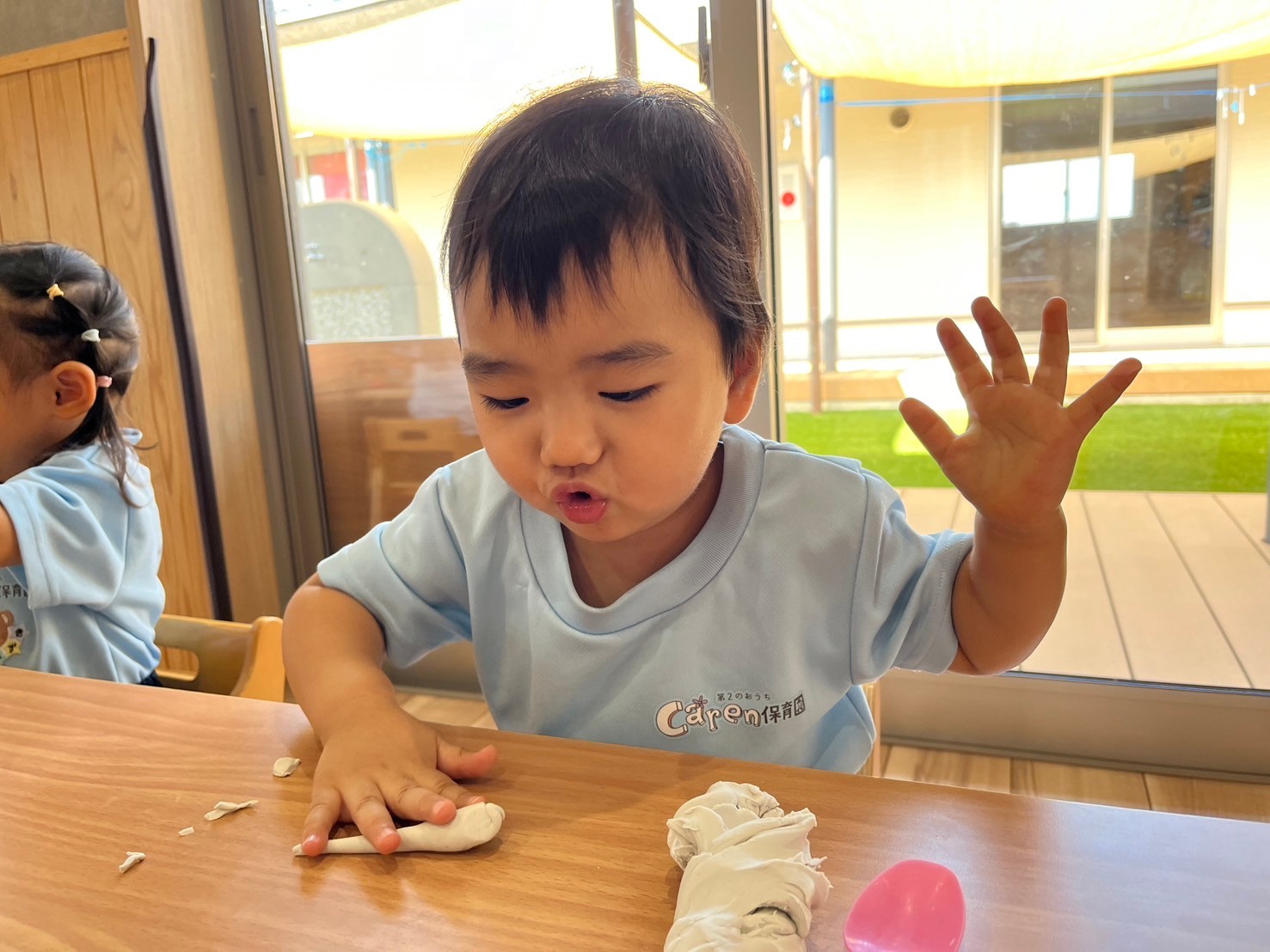 今日は、月の製作でシール貼りをしましたよ♪指に貼り付いてとれずぅ苦戦していましたが、だんだん上手になり、自分で持ち替えて貼れるようになってました😚✨