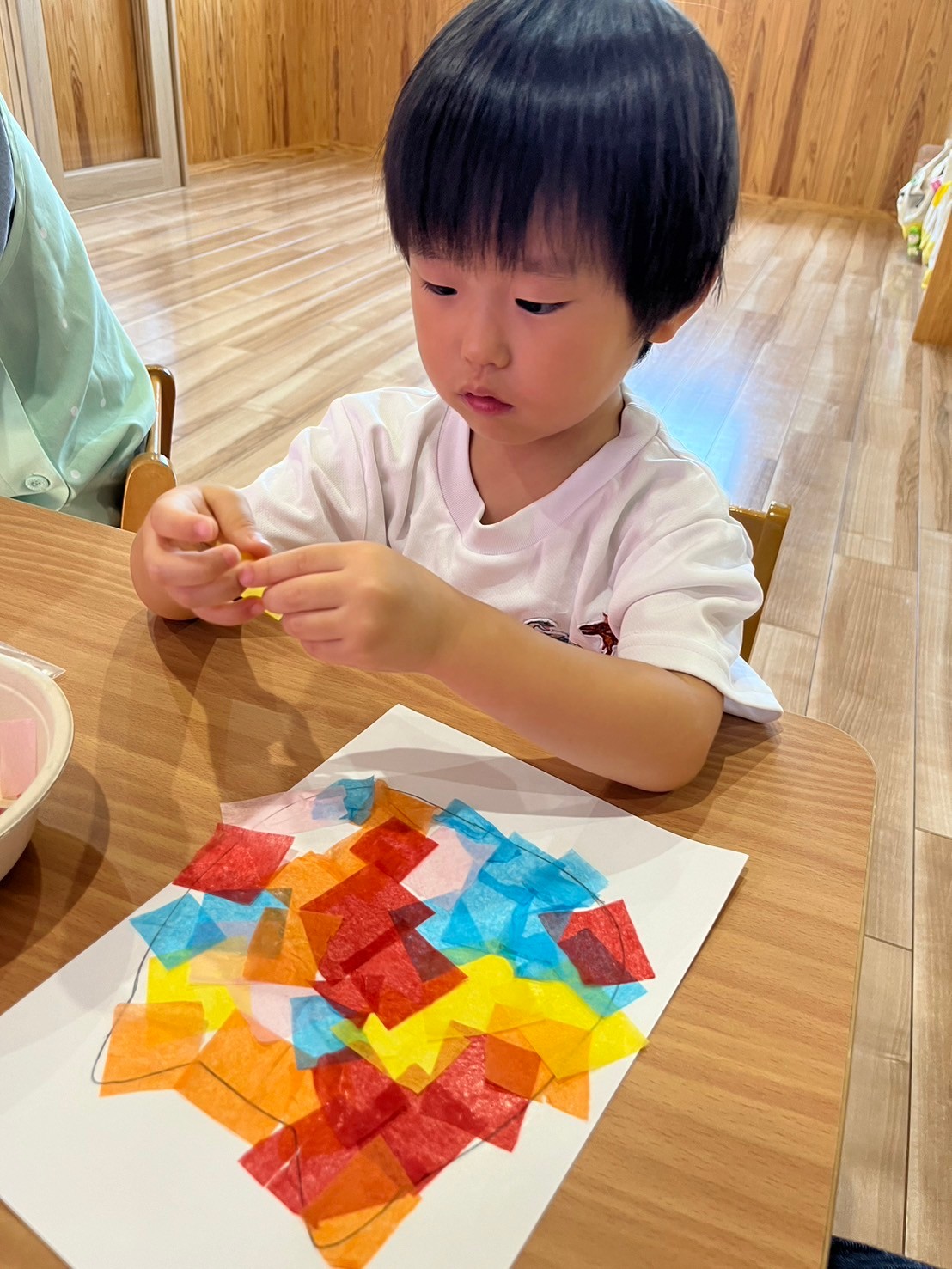 うさぎ組さんは花紙でフクロウを作り、色のバランスを見ながら貼り付け、一人一人可愛い模様のフクロウができていましたよ🦉🩷こあら・きりん組さんは、折り紙でどんぐりを折りました🥰
