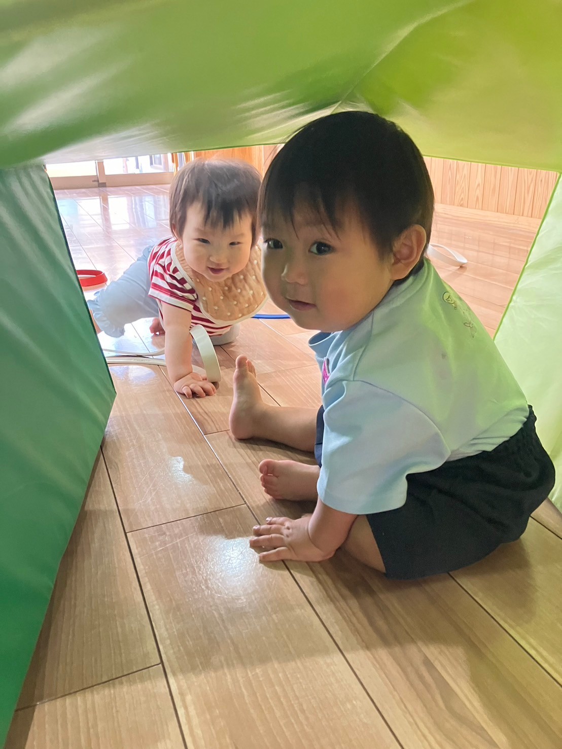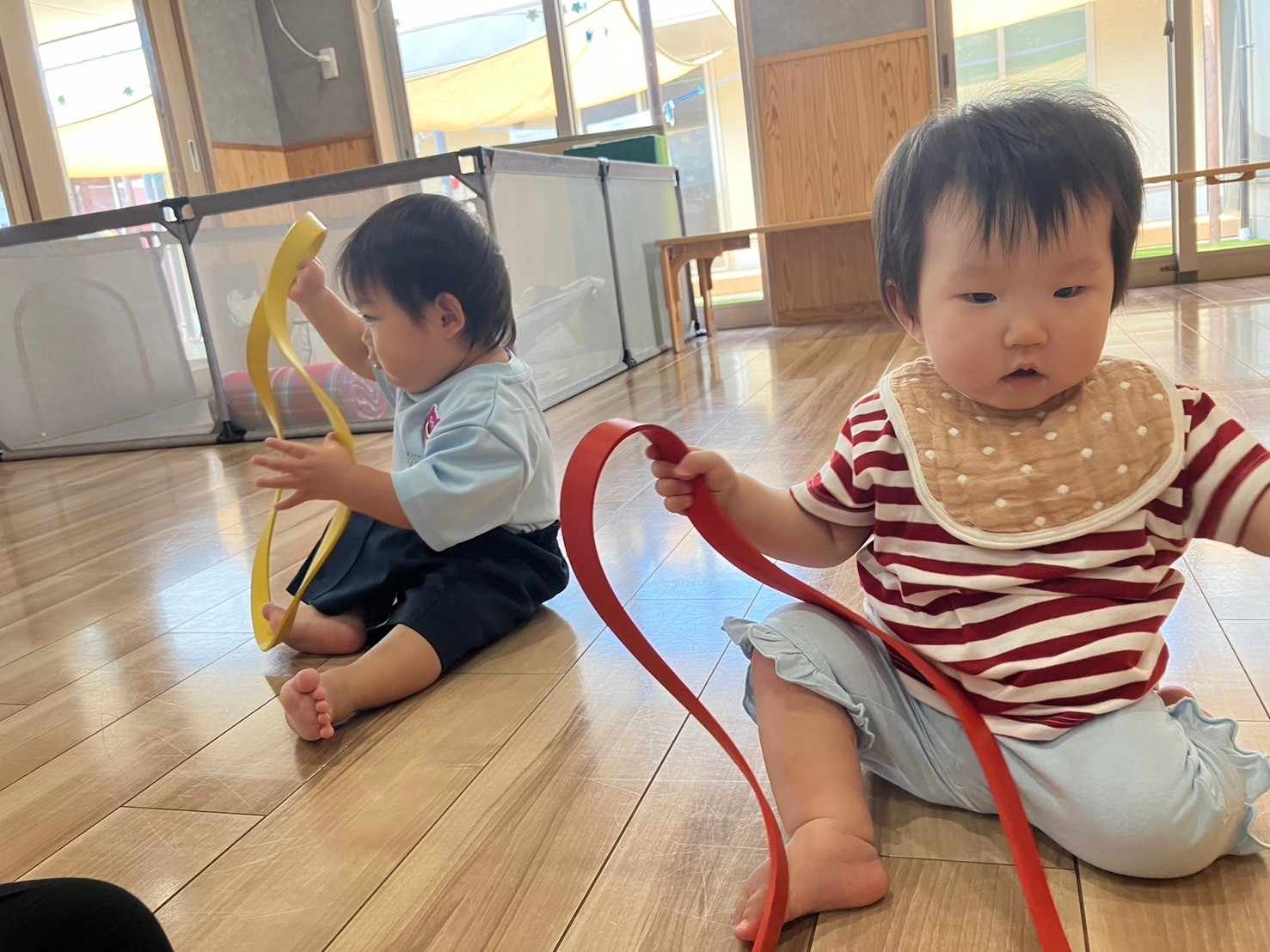 月の製作の続きで葡萄🍇やスイカ🍉、パイナップル🍍を作りました😚シールや絵の具を使い美味しそうな果物ができました☺️果物狩りに行きたくなったひよこ🐣さんです🥰その後、お部屋で輪っか⭕️をかぶり電車ごっこをしたりトンネルにしたり自分で輪っか⭕️を触って楽しんでいました🎶マットのお家も🏠嬉しそうに入っていましたよ✨りす🐿