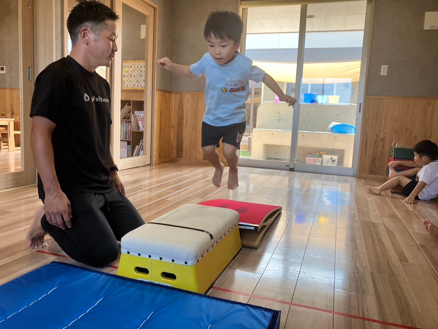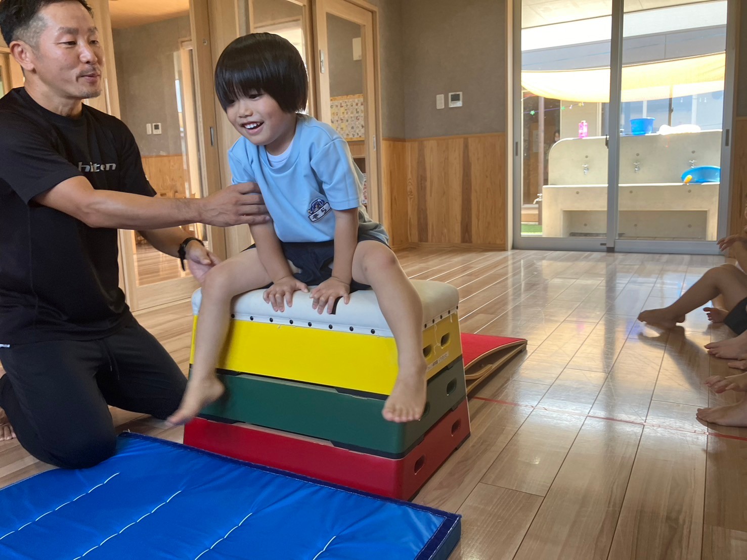 跳び箱に手を付き、ジャンプで乗ったり、その後は跳び箱の上にお尻で座れるようになる練習を行いました😊
