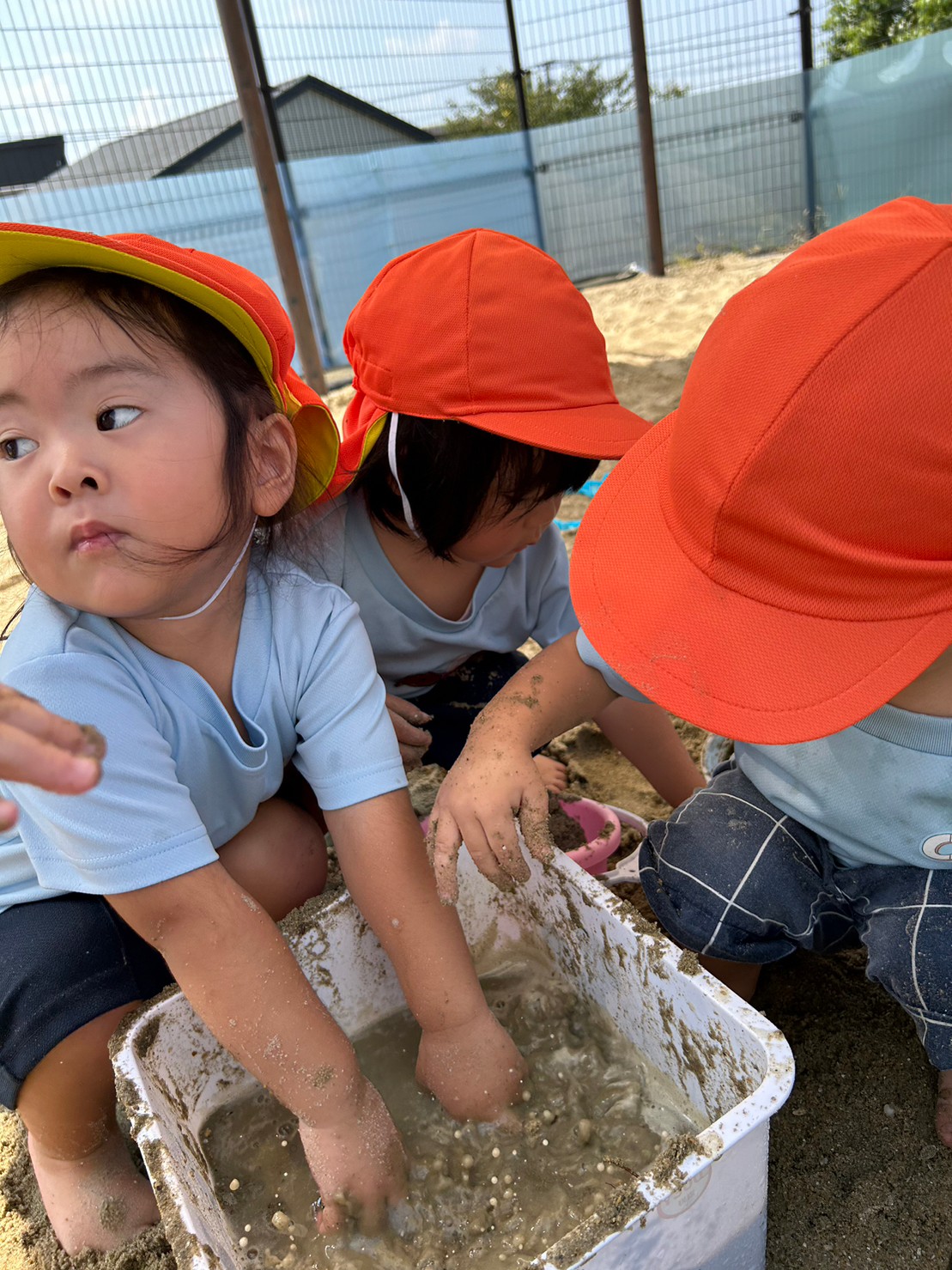 バケツ🪣に砂を沢山入れて水💦も入れて、スコップや手でペチャペチャしてその感触を楽しみました🥰