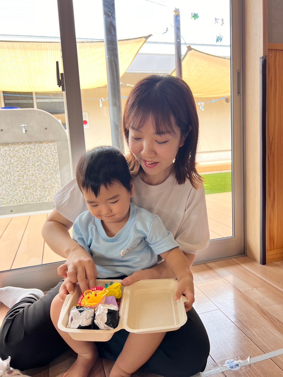 おうちの方とおにぎりを一緒に作り、バイキングのスタート!お父さんたちがお店屋さんになってくれました✨️ おうちの方と周りながら1つずつ選び美味しそうなお弁当が完成していました😋🍴