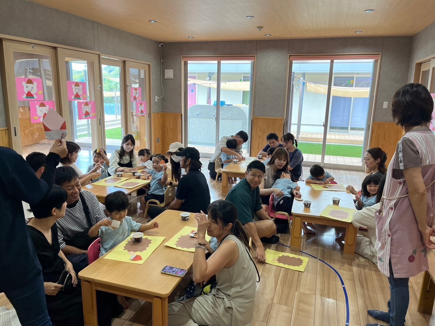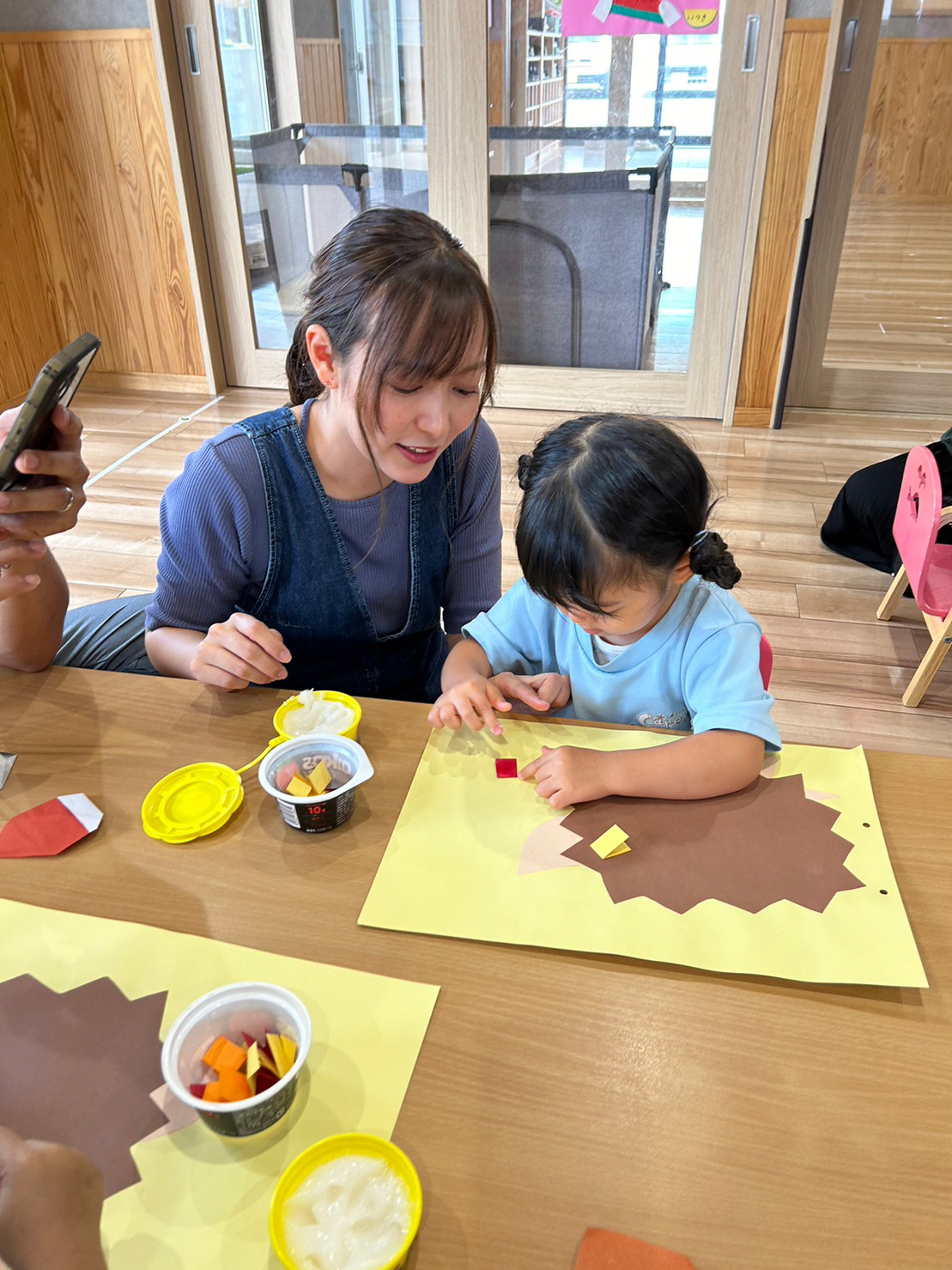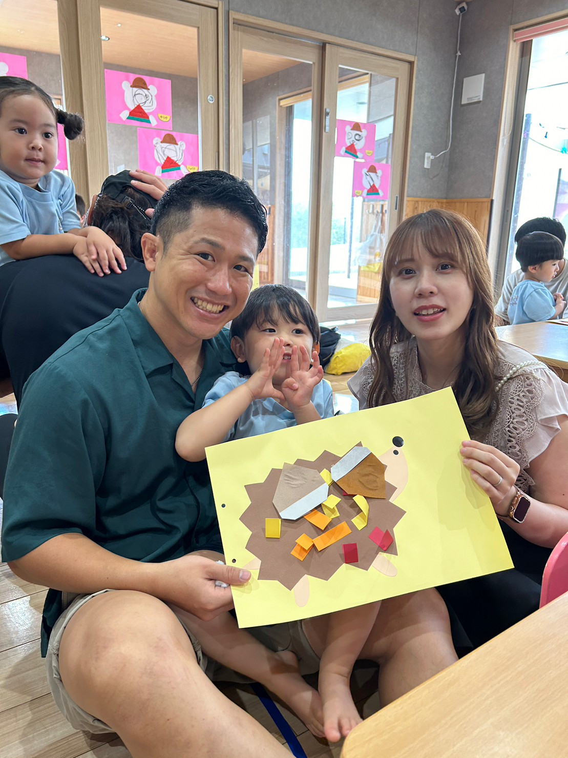 親子で折り紙で栗を折ったり、ハリネズミの針は子どもたちが画用紙を半分に折る姿を見てもらい、可愛い栗とハリネズミが完成しました❤️