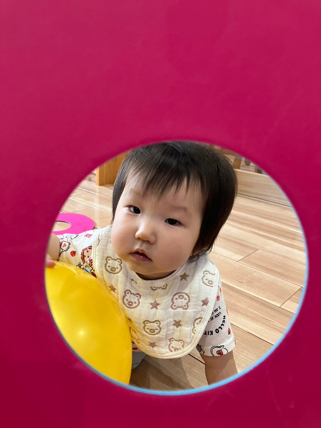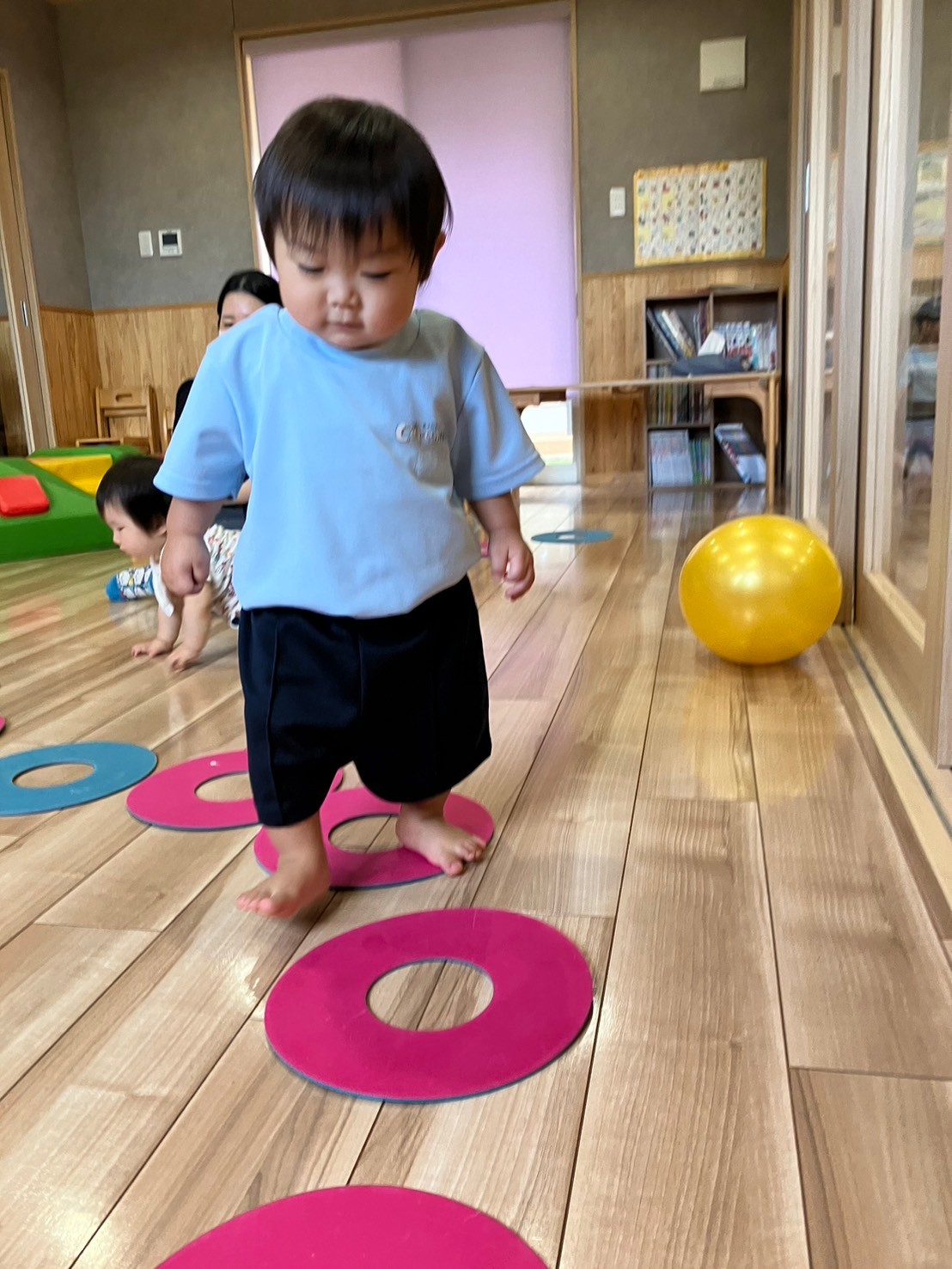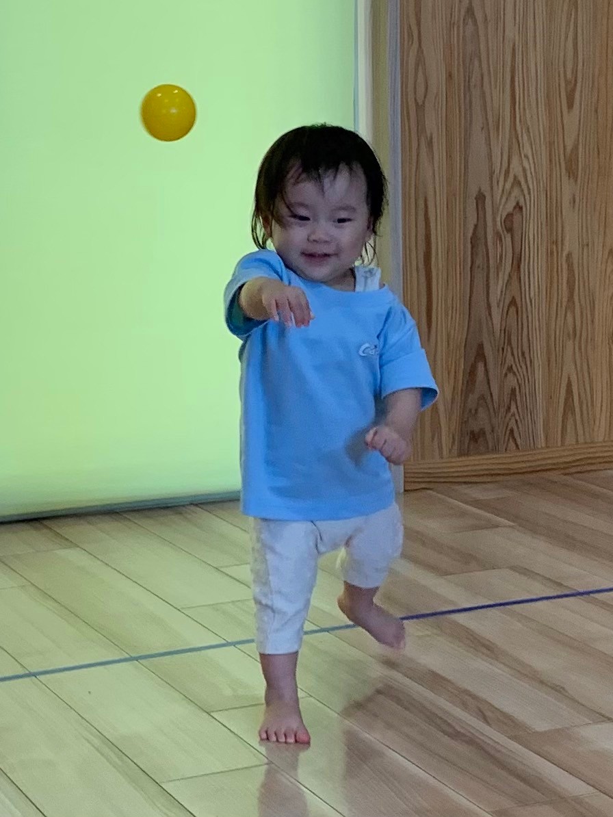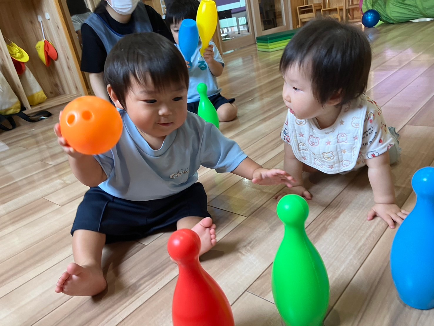 月齢によって追いかけ投げてを繰り返したり、ボーリング🎳ピンに向かって投げて当てるのを楽しんだりしていました🎶当たると自分で拍手👏して喜ぶ姿が可愛いかったです💕輪っかも頭にかぶったりハンドルに見立てたり、月齢が高い子は輪っかを並べその上を歩くこともして楽しみましたよ🥰