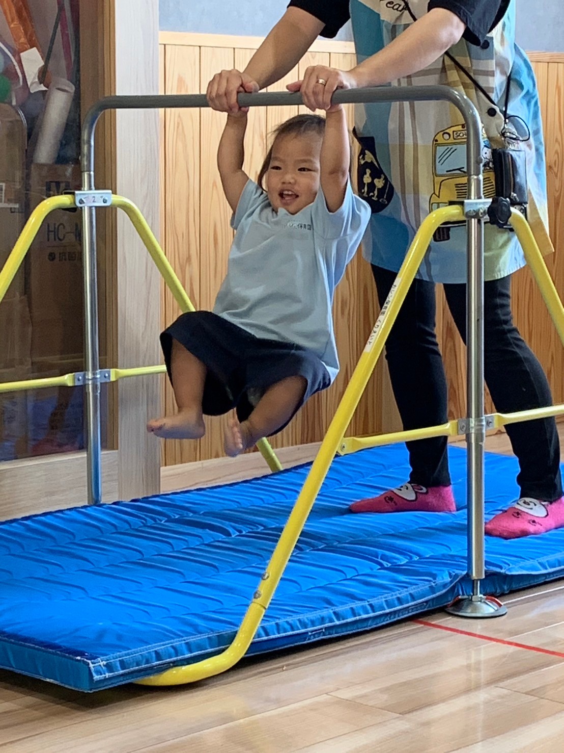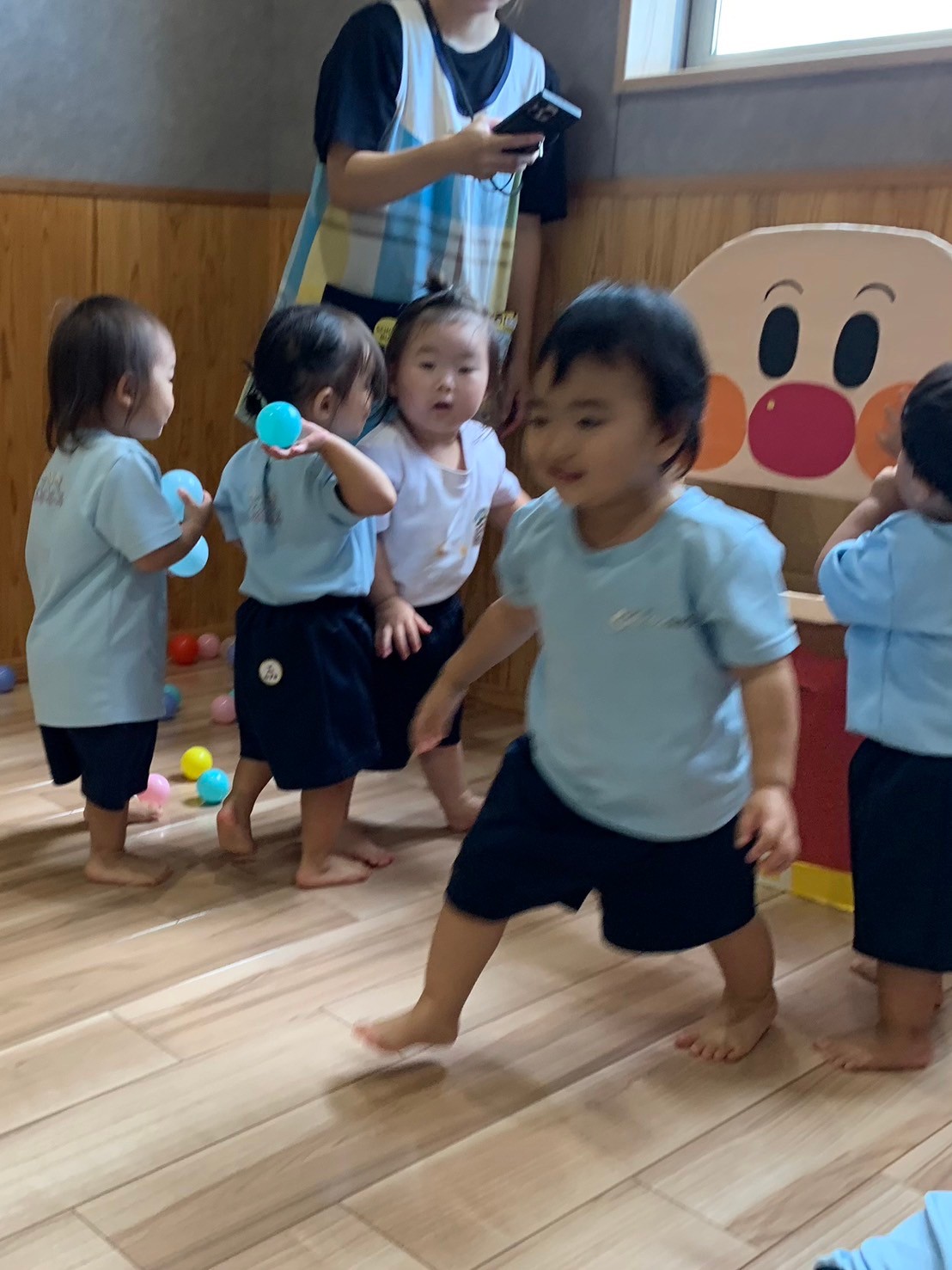 トンネル→階段→滑り台→鉄棒の順に一人ずつ先生と進み、鉄棒にぶら下がった後はカッコよくポーズを決めました🙌順番を待っているお友だちは頑張っているお友だちを応援しながら待ちましたよ😄みんな上手に出来ていました❣️その後はアンパンマンの口にに小さなボールをたくさん投げ入れて遊びました😊ボールの投げ方も上手になって来ました💓ボールの色も「あか」「あお」と分かるお友だちもいましたよ!