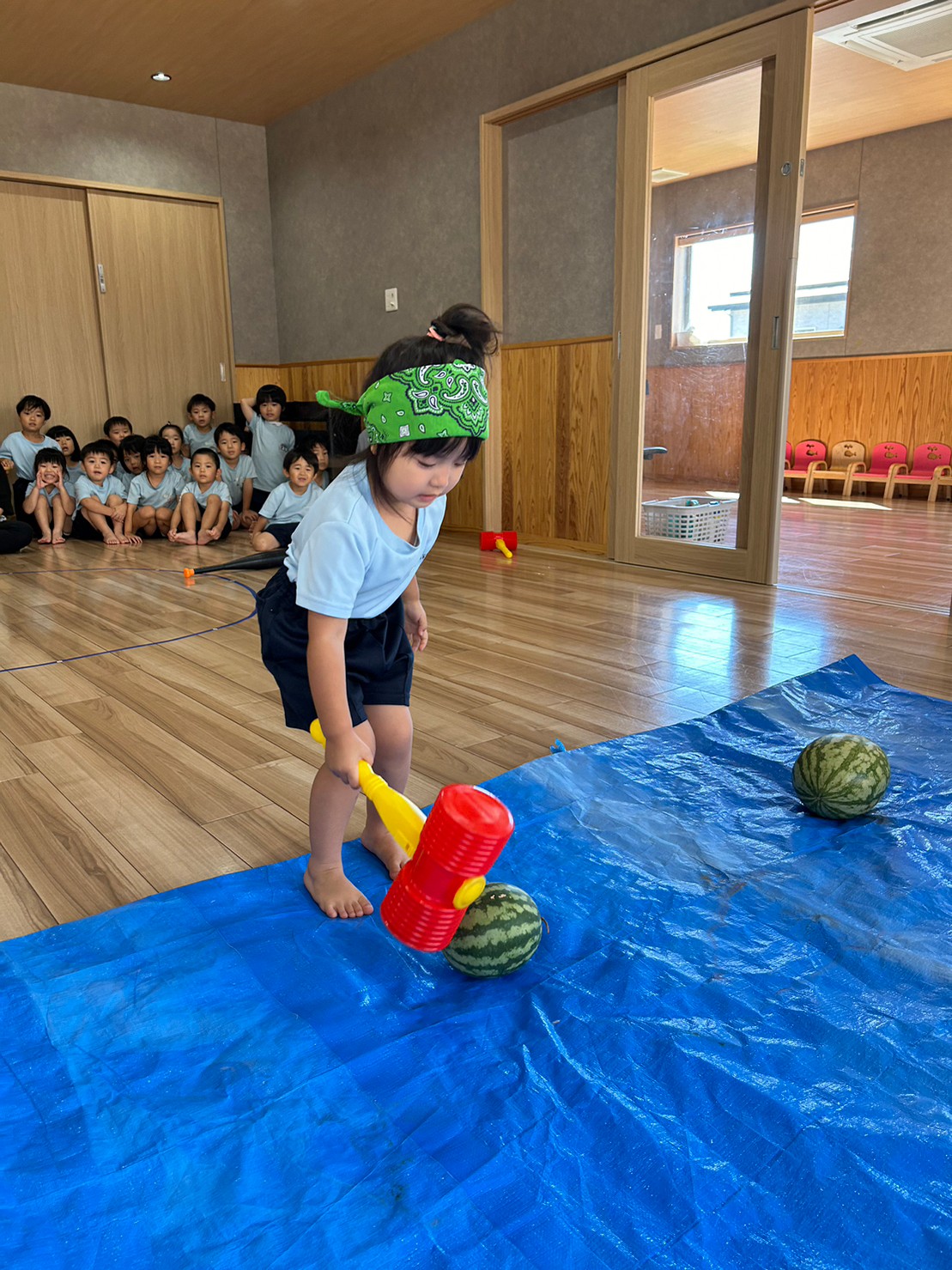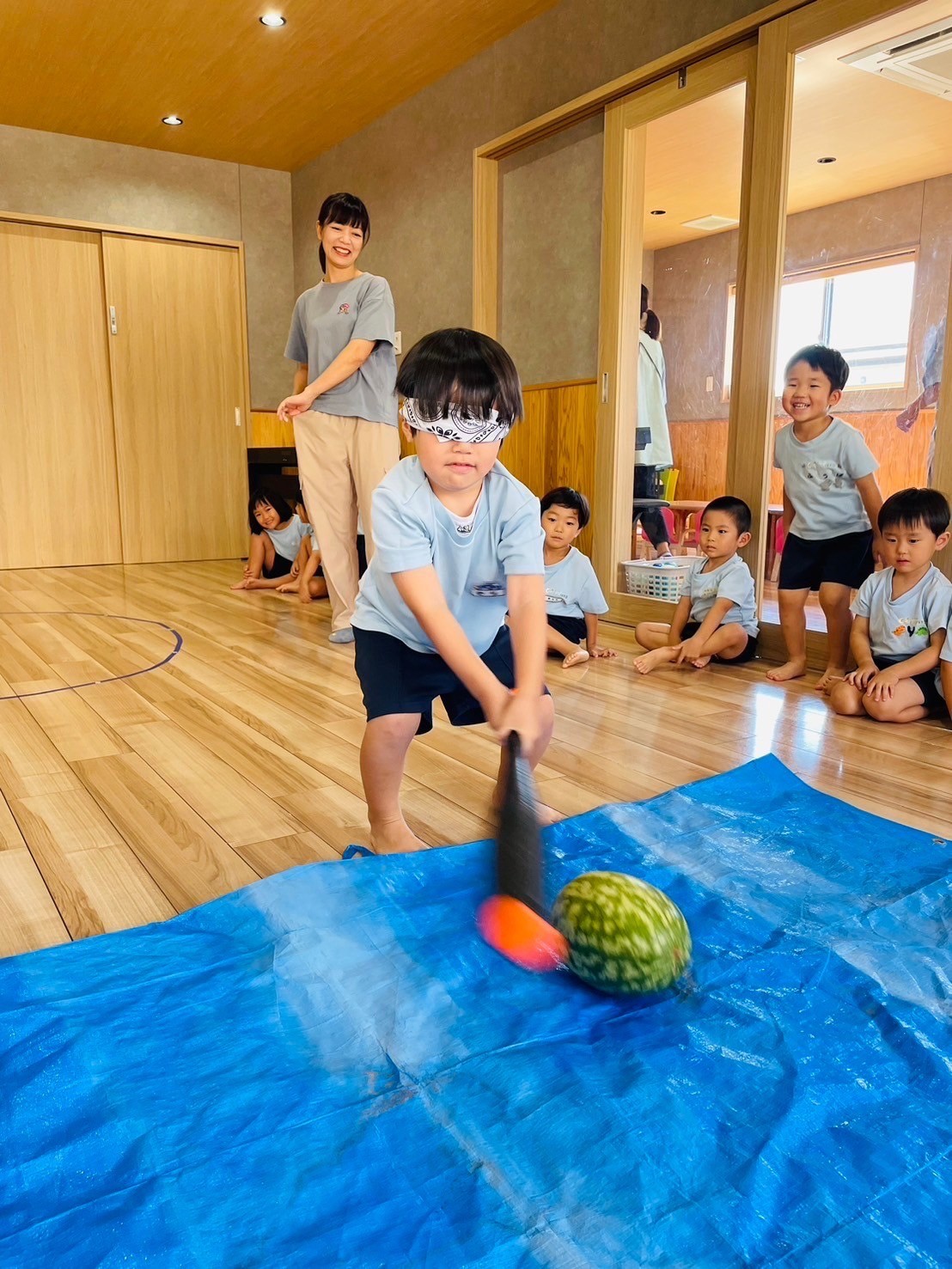 その後は全児でスイカ🍉割りもしました! 先生と一緒に頑張ってチャレンジしましたよ☺️