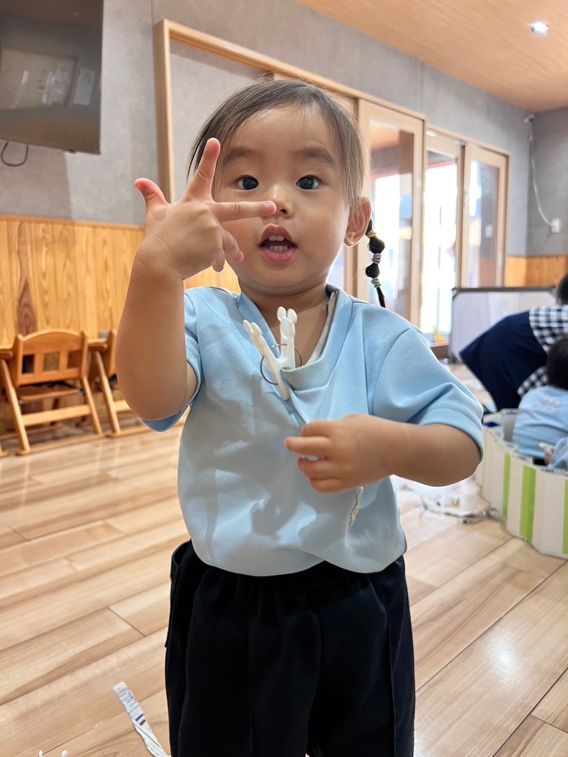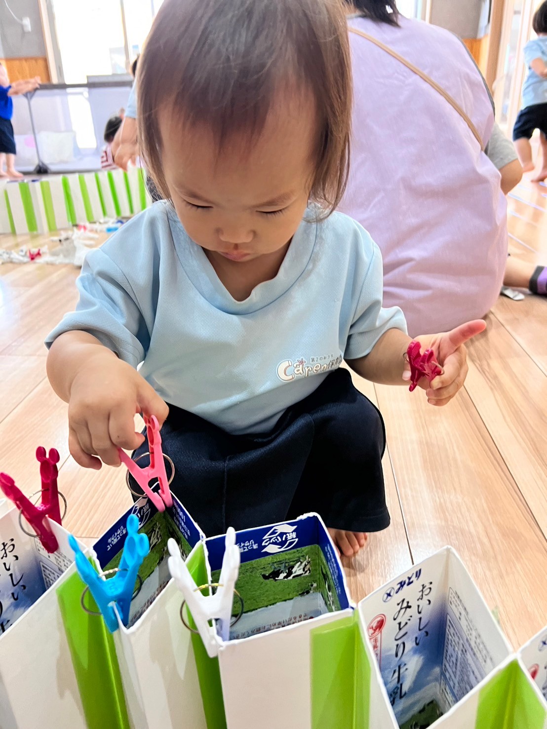 その後はお部屋で新聞紙や洗濯バサミ遊びをして指先を使って沢山遊びました!どんどん指先に力が入るようになって1人でどんどん牛乳パックに挟んでいくお友達も増えてきましたよ🥰