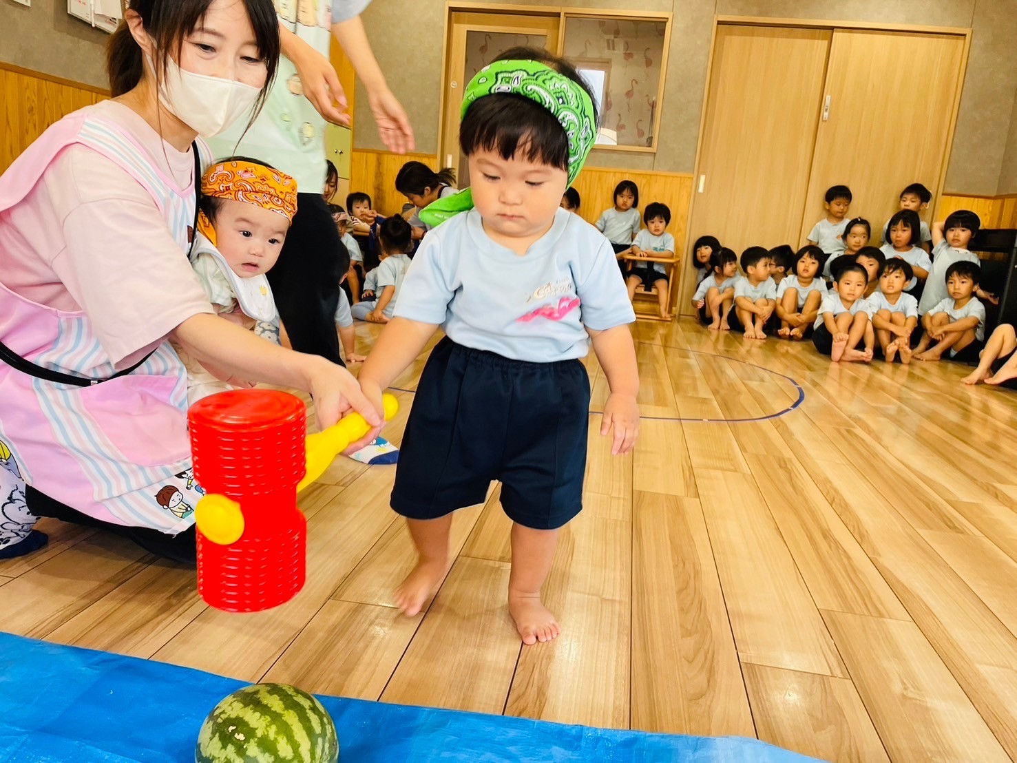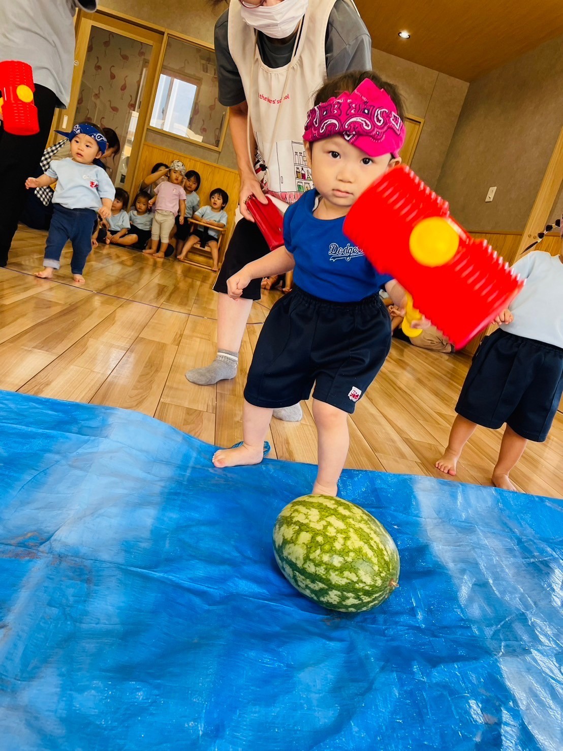 おもちゃの大きなトンカチでスイカを思い切り叩き、何回も叩いてみたけど残念ながら、パンダ🐼組さんは割ることができませんでした🤣