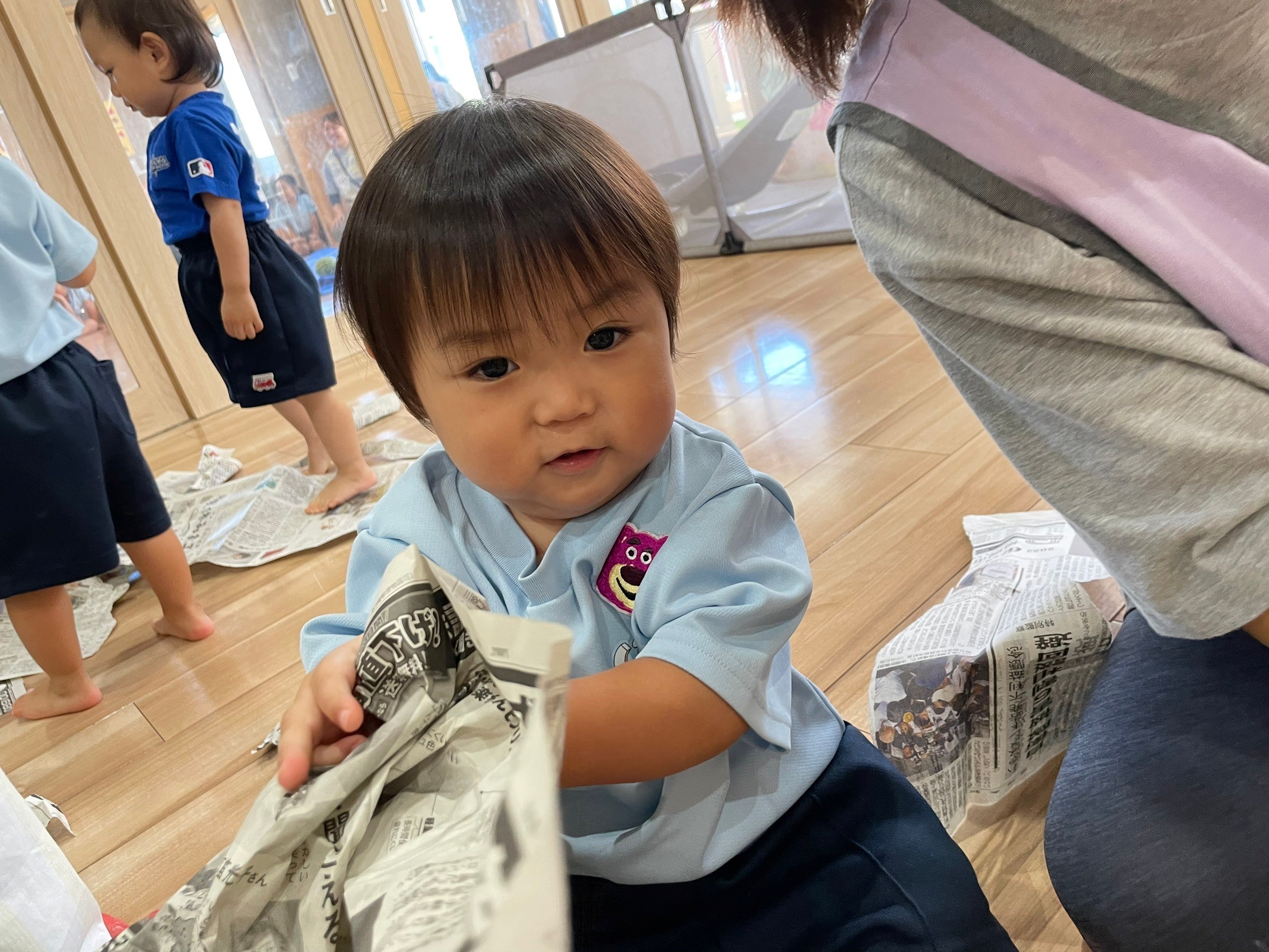 りす組と合同でした新聞紙遊びでも、お友達や保育者がやっている真似をして活動を楽しむ事ができました🥰