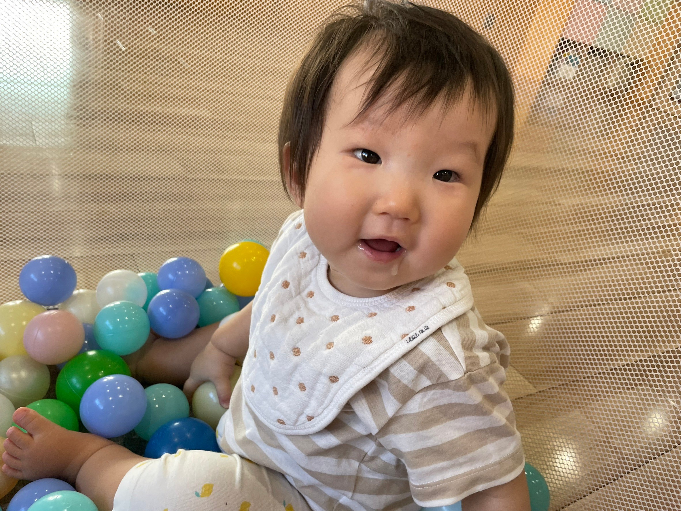 まだまだ暑い日が続いているので、サークル内にたくさんボールを出し、ボールプールにして遊びました😊