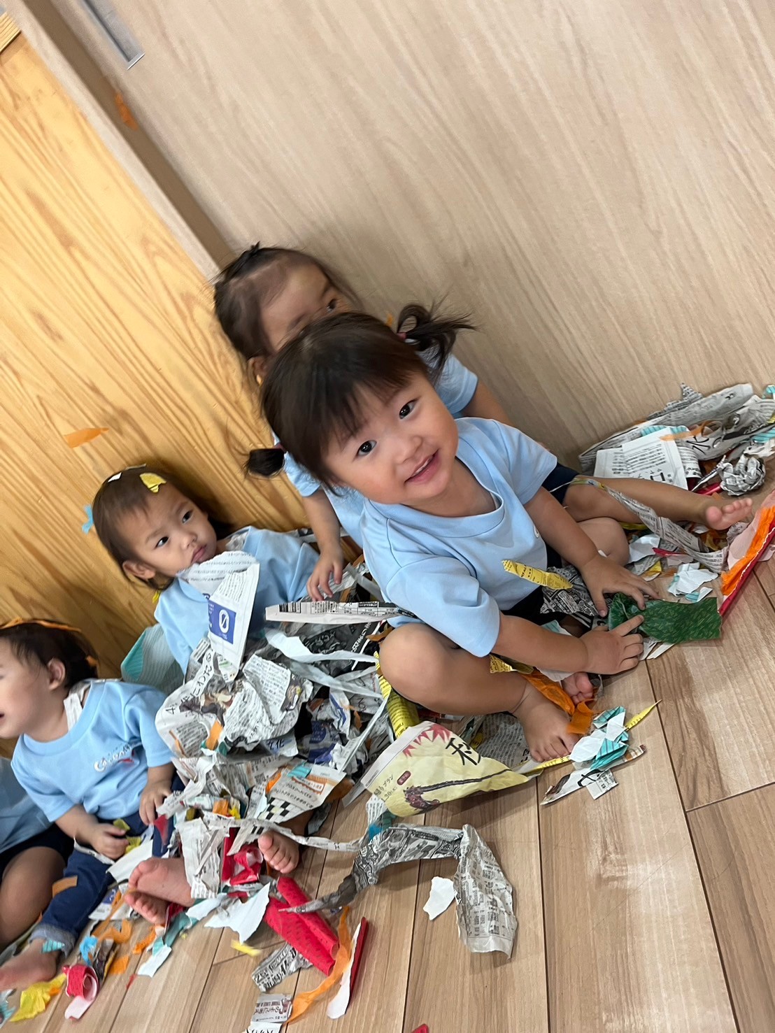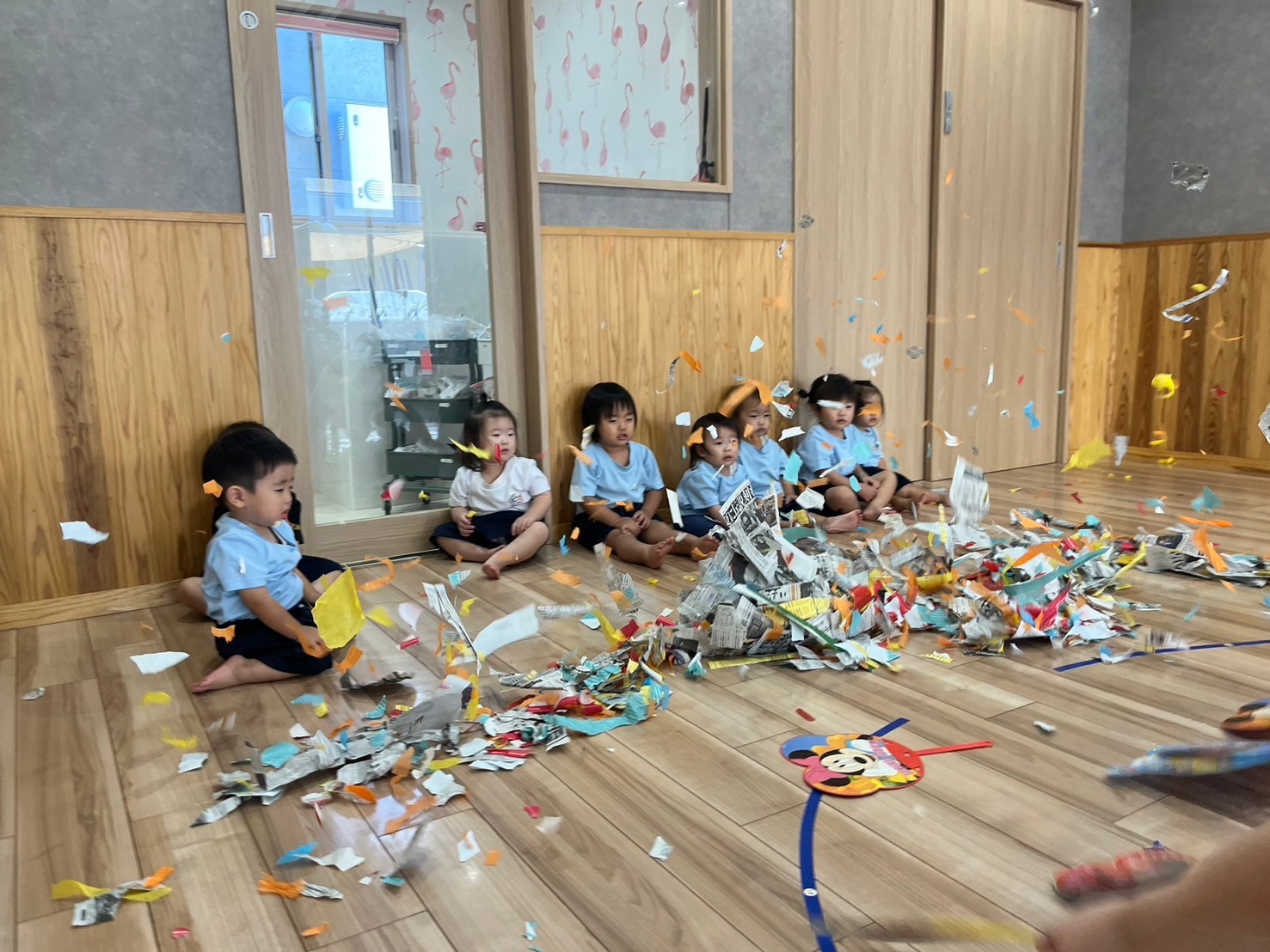 その後は新聞紙や赤やオレンジ、水色の花紙をみんなでちぎり、うちわをパタパタして風で散して遊びました😄風と巻き上がる紙に歓声を上げて楽しみましたよ😆ぱんだ組🐼