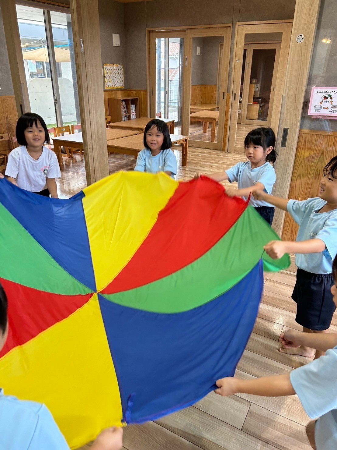 パラバルーンを使った活動では、「月」の歌に合わせて2拍子と4拍子を感じながらみんなでパタパタしたりふんわりしたりと楽しみましたよ❣️