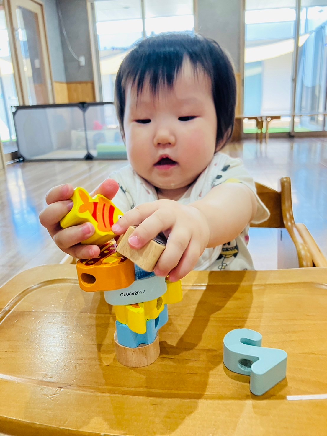 始めに積み木あそびをしましたよ🥰色んな絵柄の積み木を見たり、ならべたり、積み上げたりしていきました✨上手に積み上げていき出来たら嬉しそうに自分で拍手👏していましたよ♡その後は崩れるのを楽しんでわざと崩してケラケラ笑う子どもたち✨下に積み木を落とし先生が落ちないように取るやりとりを楽しんでいました😆
