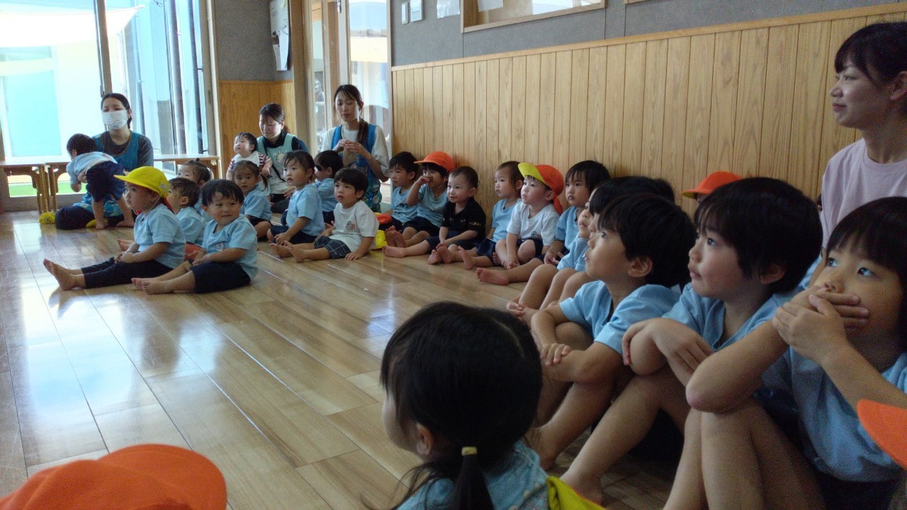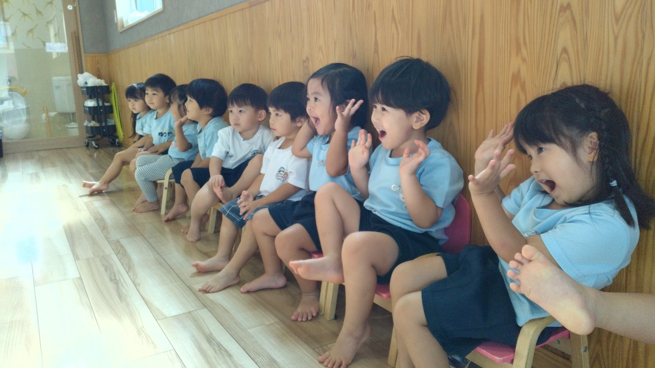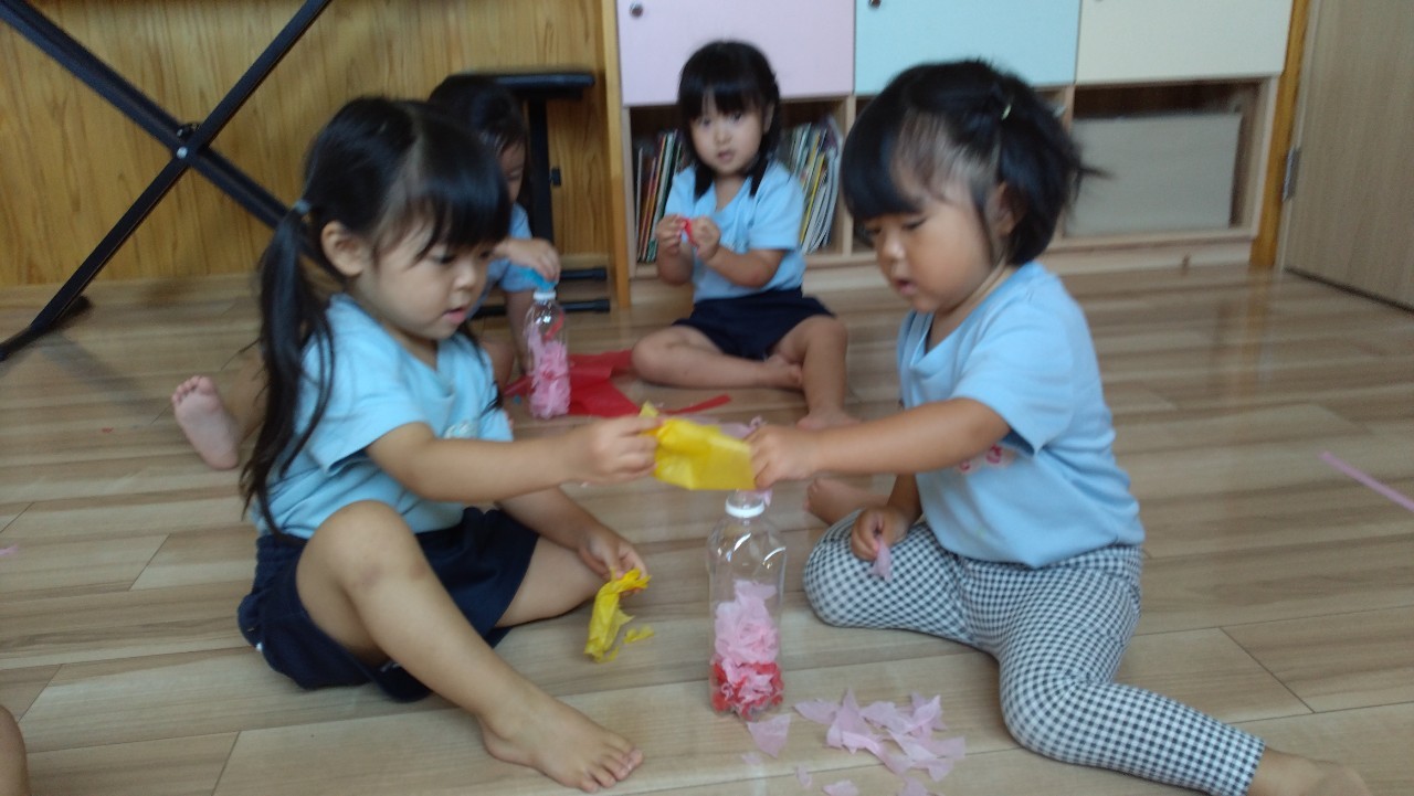 今日は英語教室の日でした✨englishカードに反応していろいろな顔の表情遊びをしたり、歌をうたって楽しそうでした♫それからお花紙でセンサリーボトルを作って遊びました😄お友だちと2人組になってお花紙をビリビリ〜と細かくちぎって仲良くボトルに詰めてお水を入れるとフリフリ〜とシェイクしました。みんな、カラフルな色の変化に興味津々でしたよ😳お部屋を少し暗くしてボトルをライトアップ🔦もしてみました✨「キレイ〜」「これ〜すき〜😍」の声も聞かれました😆その後は園庭で滑り台やトンネル、ボール遊びをして元気いっぱいでした🌞そして避難訓練にも参加しました。だんご虫ポーズをして避難できました✌️うさぎ、こあら、きりん組