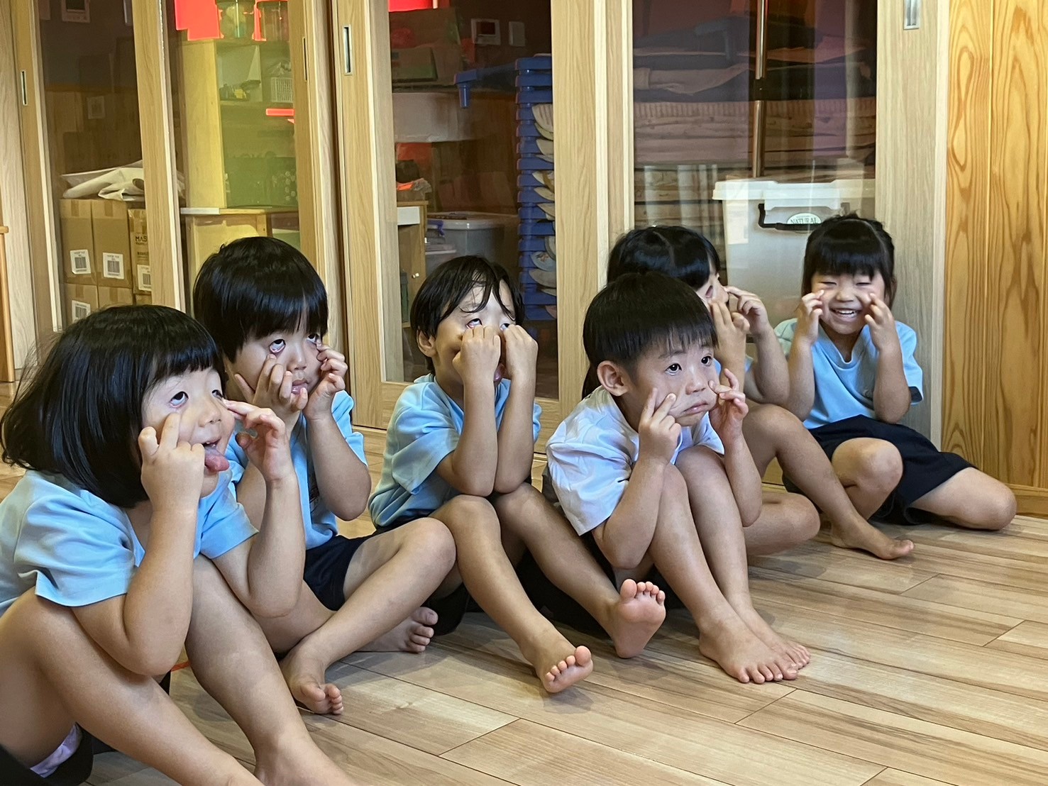 友達と表情を見せ合いこしながら、とても楽しそうでしたよ😊その後はポピーをしたり、発表会の歌の練習をし、地震からの火災、津波の避難訓練がありました‼️