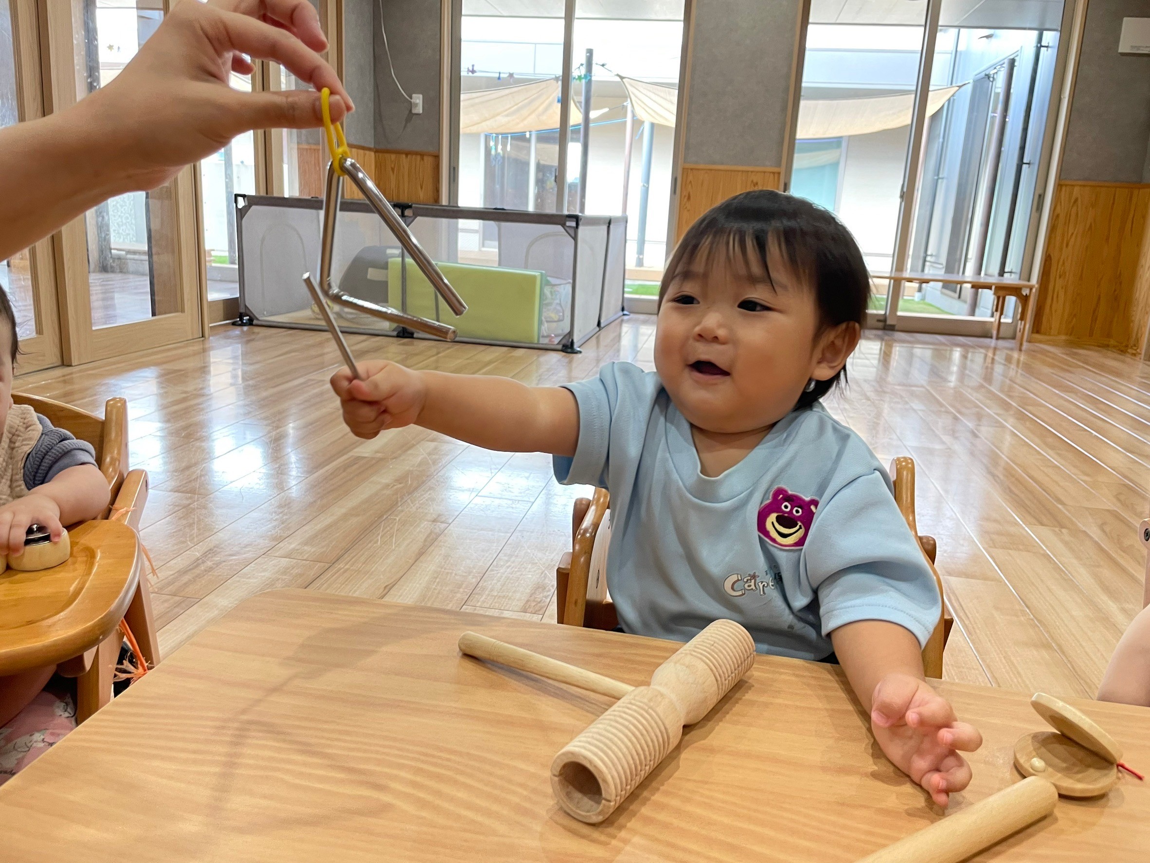 タンブリンやマラカス、鈴を保育者の真似をして鳴らしてみましたよ💕