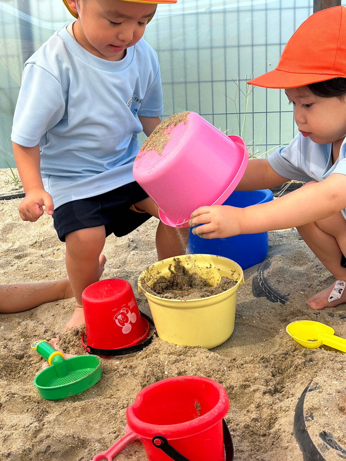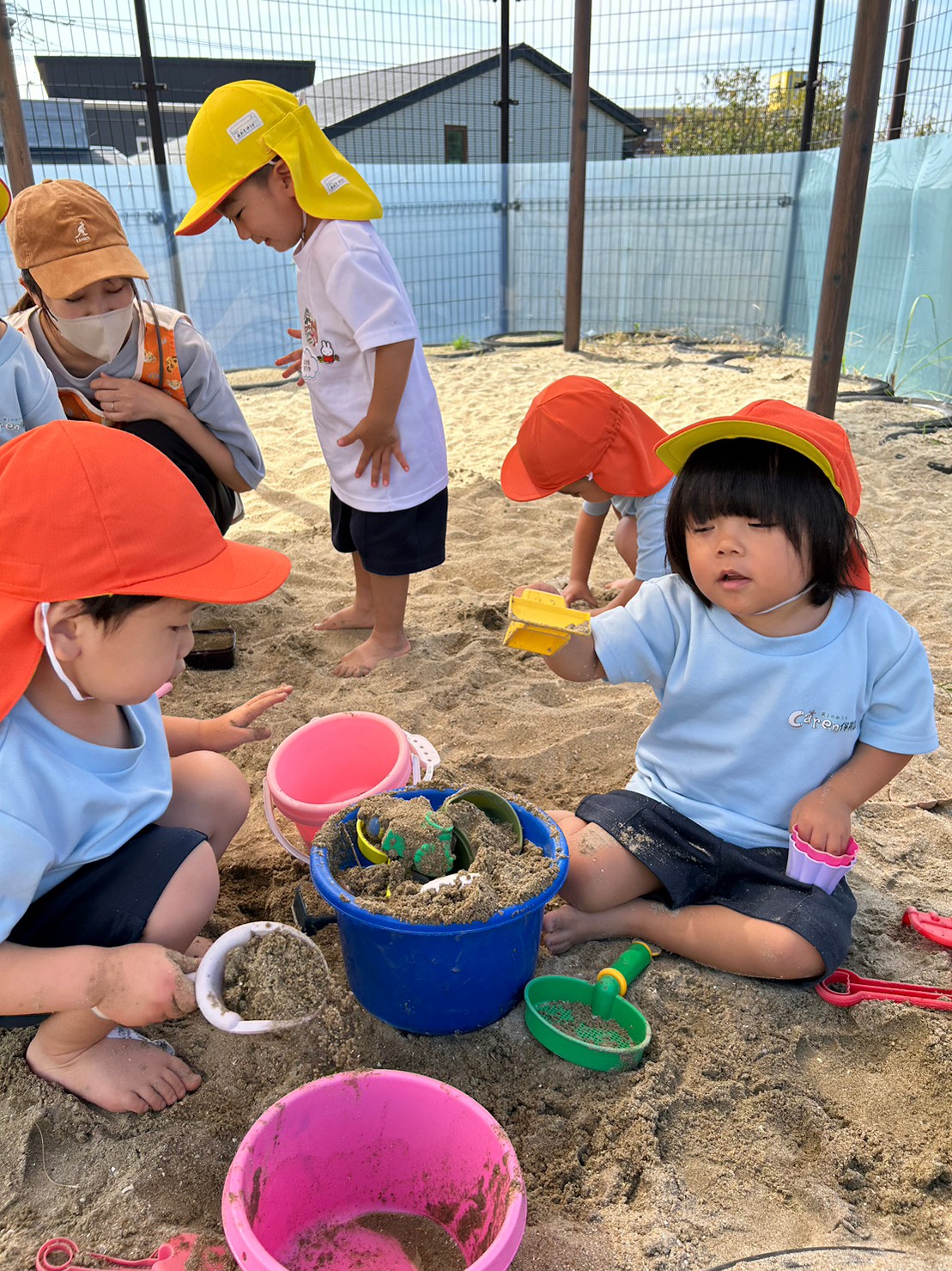 ベチャベチャしたり中におもちゃの具を入れたりして、グループになって楽しそうに作り「はいどうぞ🍛」と先生達に食べさせてくれましたよ🎶