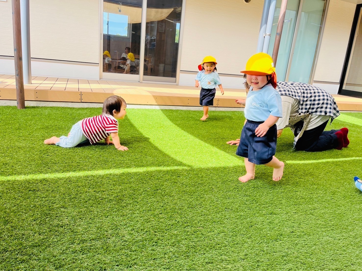 その後、園庭でシャボン玉🫧をしていき出てくるシャボン玉を目で見て追いかけさわっていきましたよ🥰りす組🐿