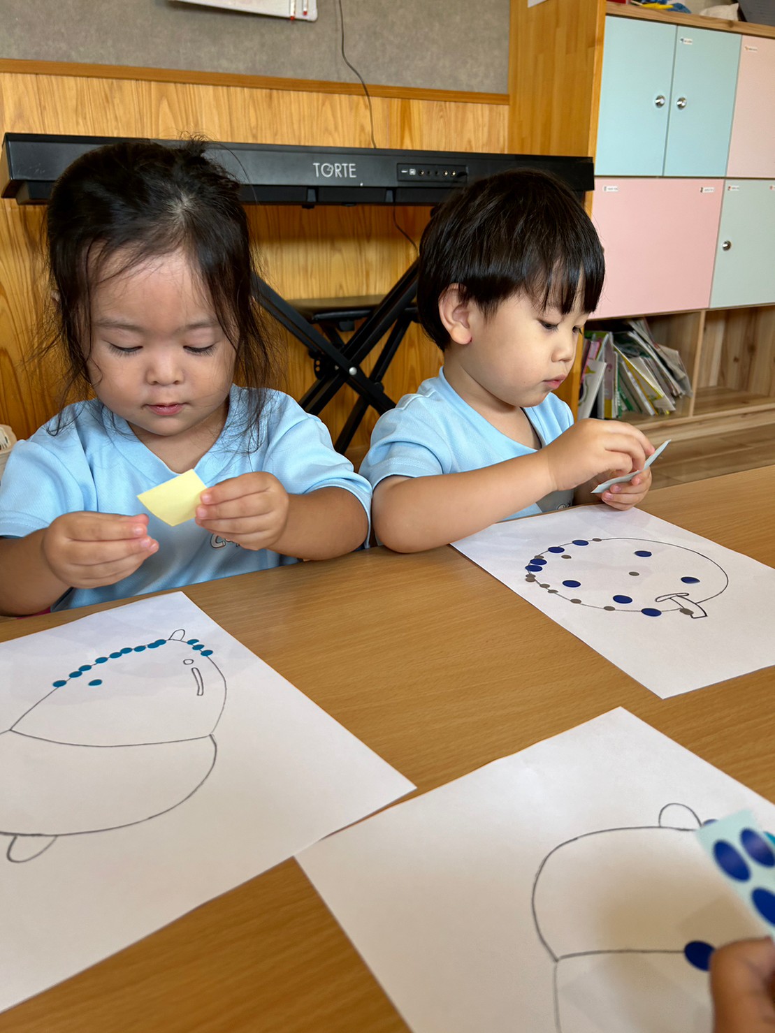 秋の果物や自然物を皆んなで出し合い、今日はどんぐりと梨の形の台紙に好きな色の🩵🩷シールを貼っていきました💓