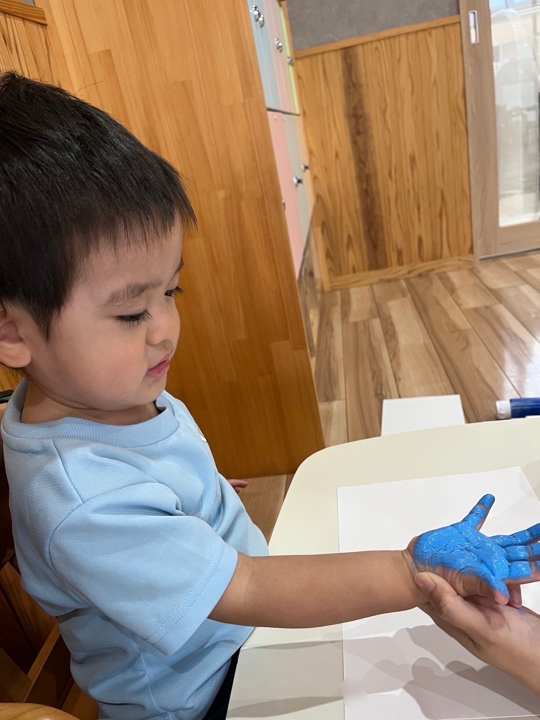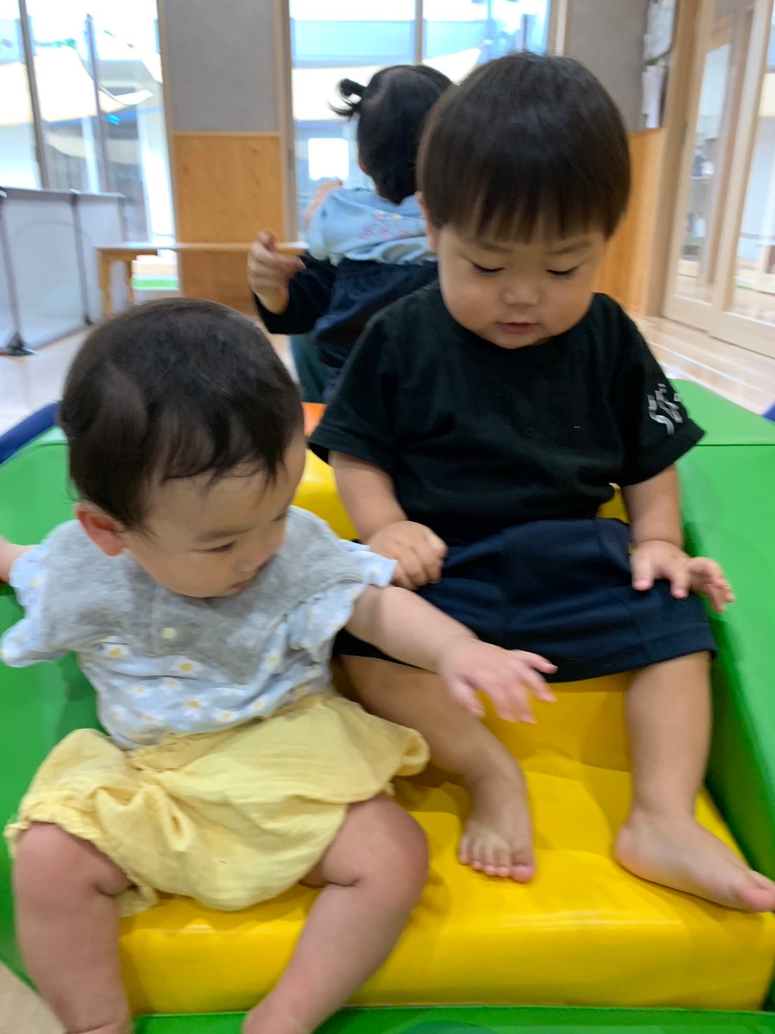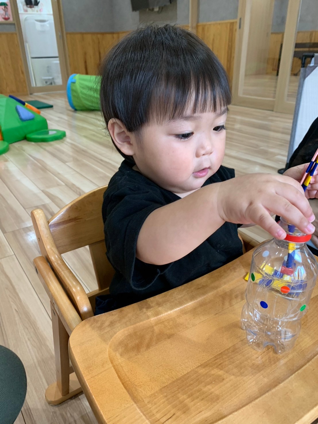 豪快に階段を上って滑り下りたり、大好きなトンネルを潜ったりしてたくさん身体を動かして遊びましたよ❣️ずり這いのお友だちもトンネルを覗いてみたり、階段を上ってみたりして楽しんでいました😃その後は指先遊びのポットン落としをしました✋慣れた様子で集中して取り組んでいましたよ😊りす組🐿