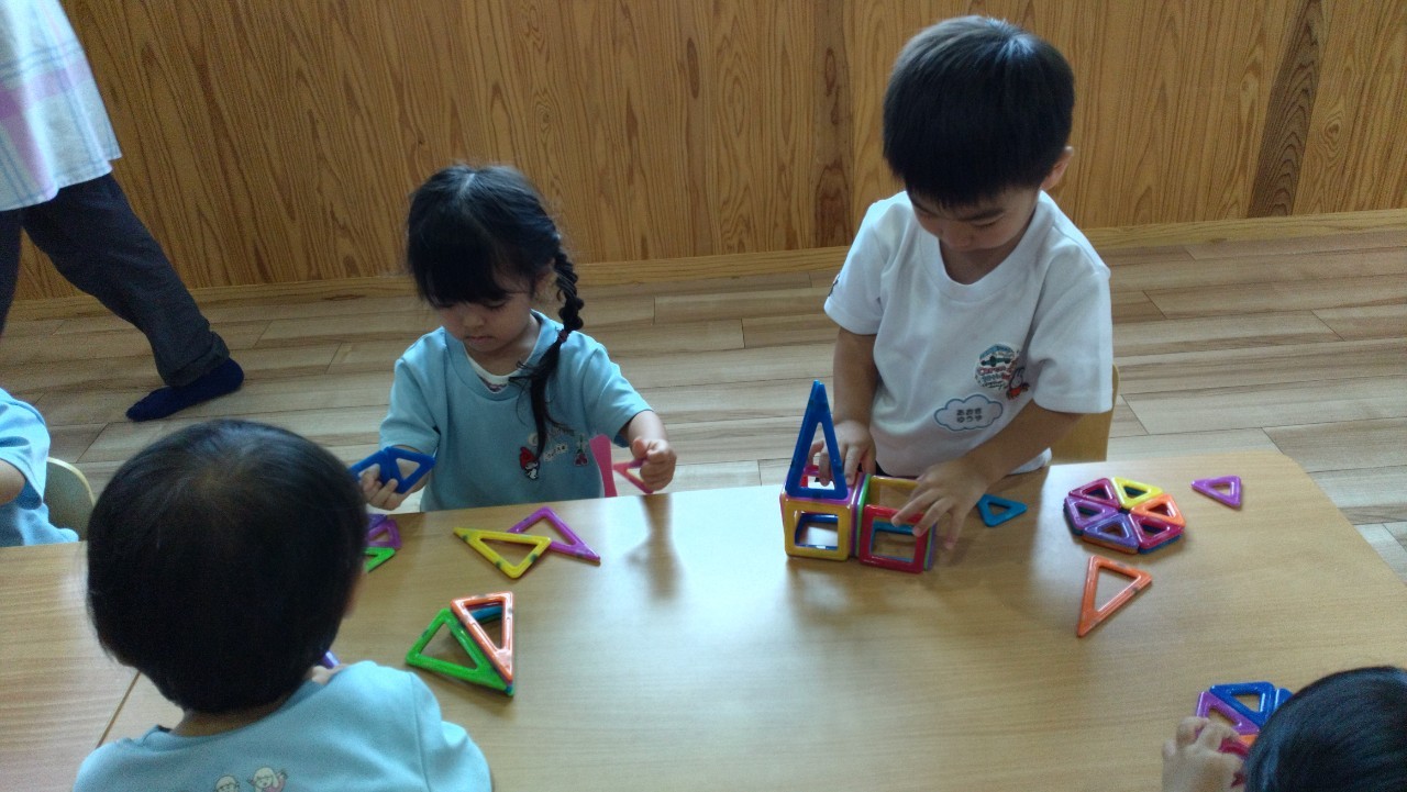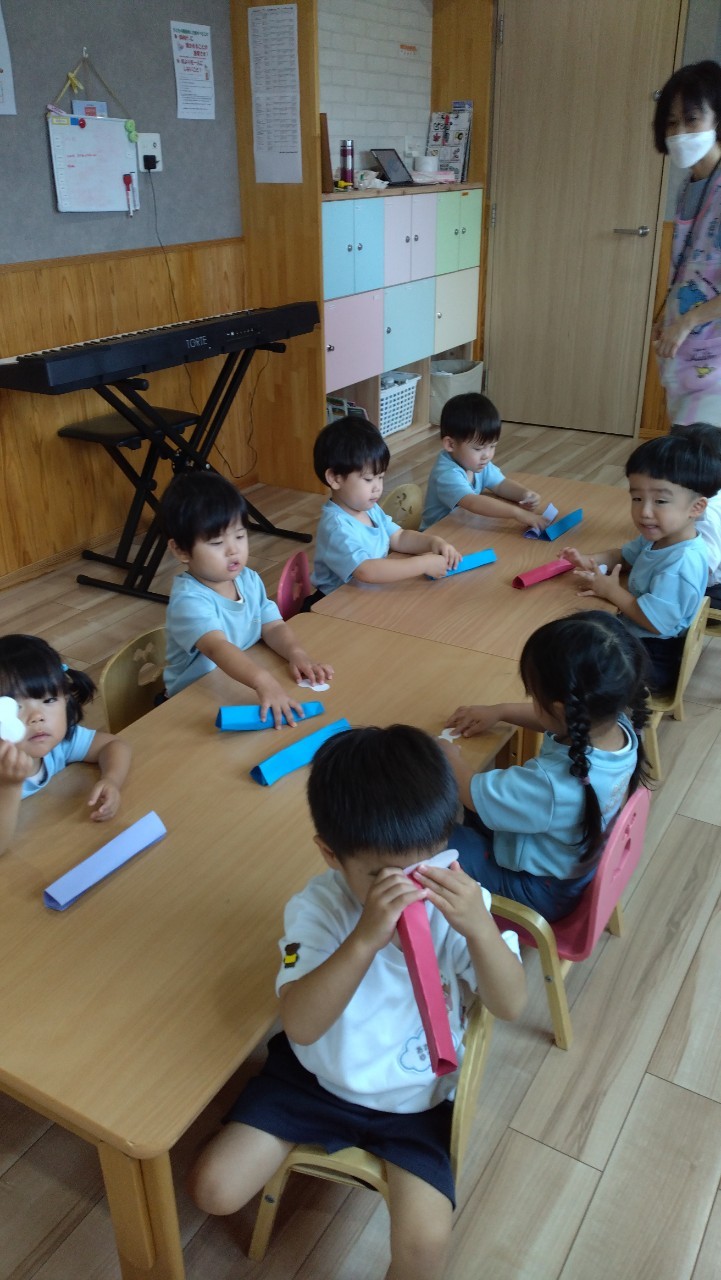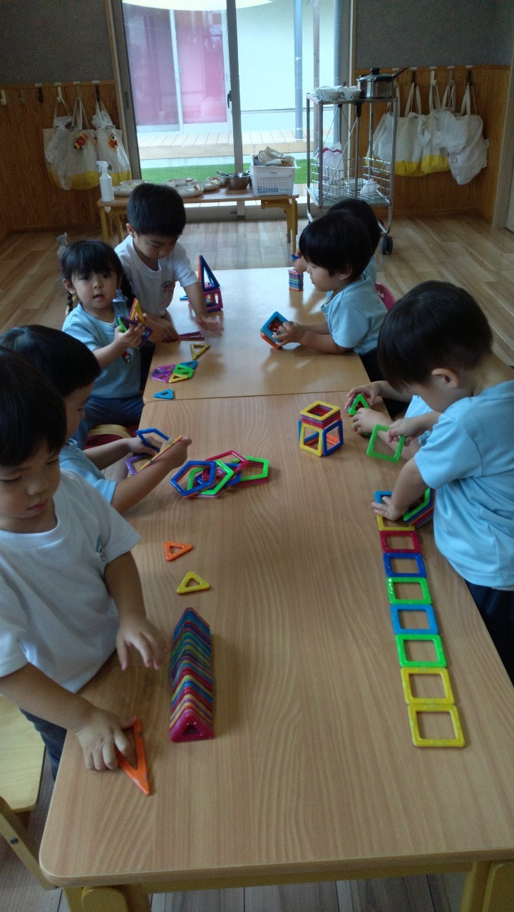 今日はトンボ(トンボ)の製作をしました✨好きな色のトンボや目玉シールを選んで折り紙(半分折り)をしたり、ペタペタ〜と集中してシール貼りを頑張りました😊自分だけのお気に入りのトンボさんが出来上がりました!♫トンボのメガネの歌をうたって、お部屋に吊して飾るとみんなで大興奮でした😆💕その後はマグフォーマーで磁石がくっつく面白さを楽しみながらタワー🗼やアイスなど沢山作って遊びました😄💕うさぎ、こあら、きりん組