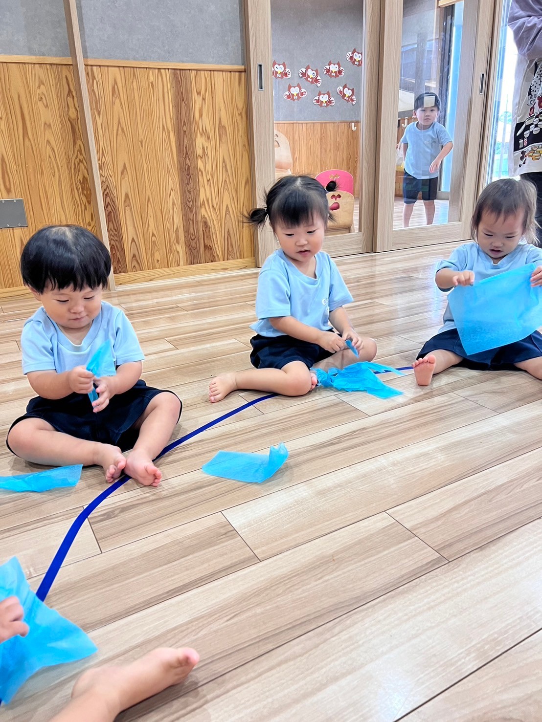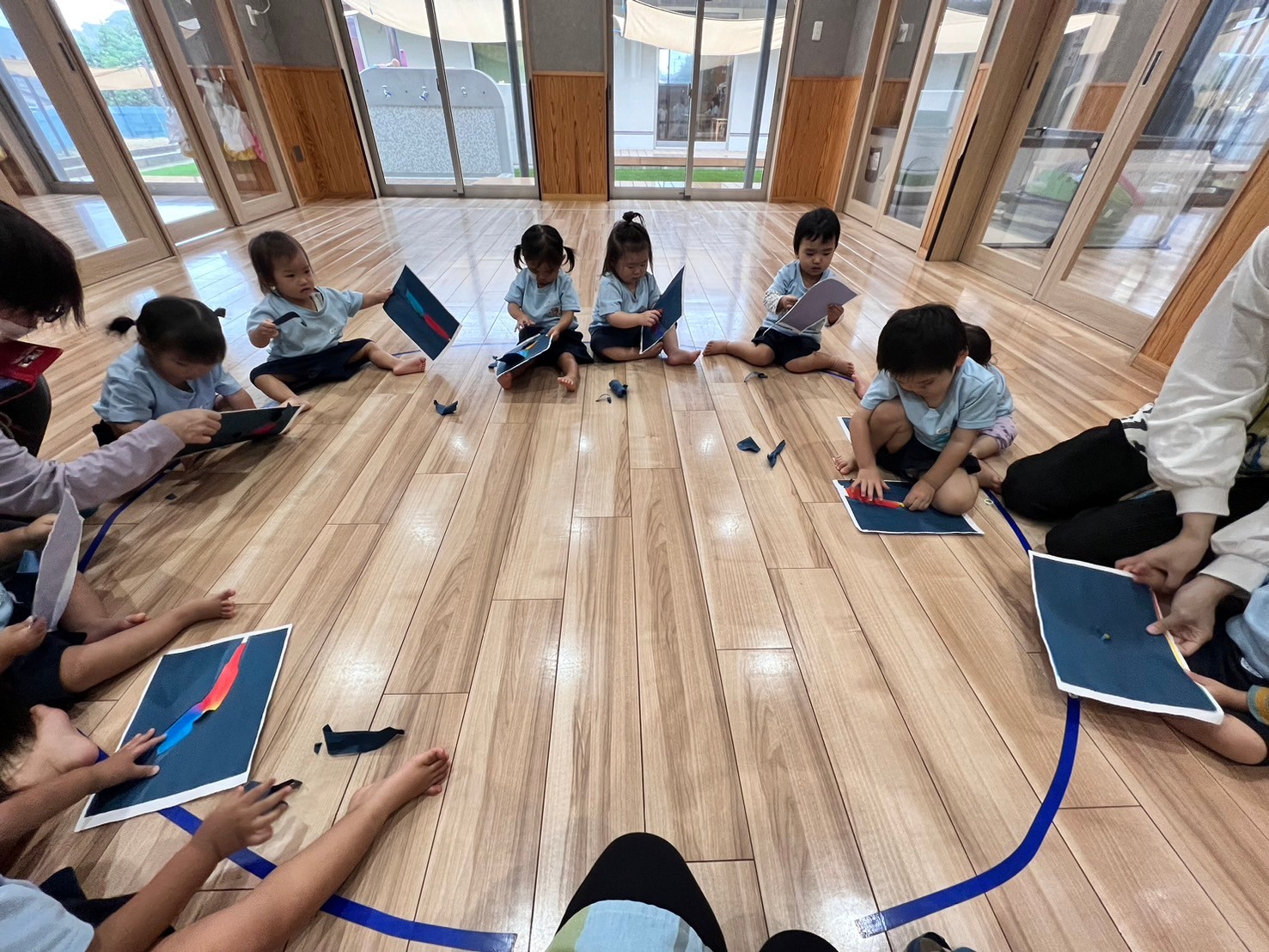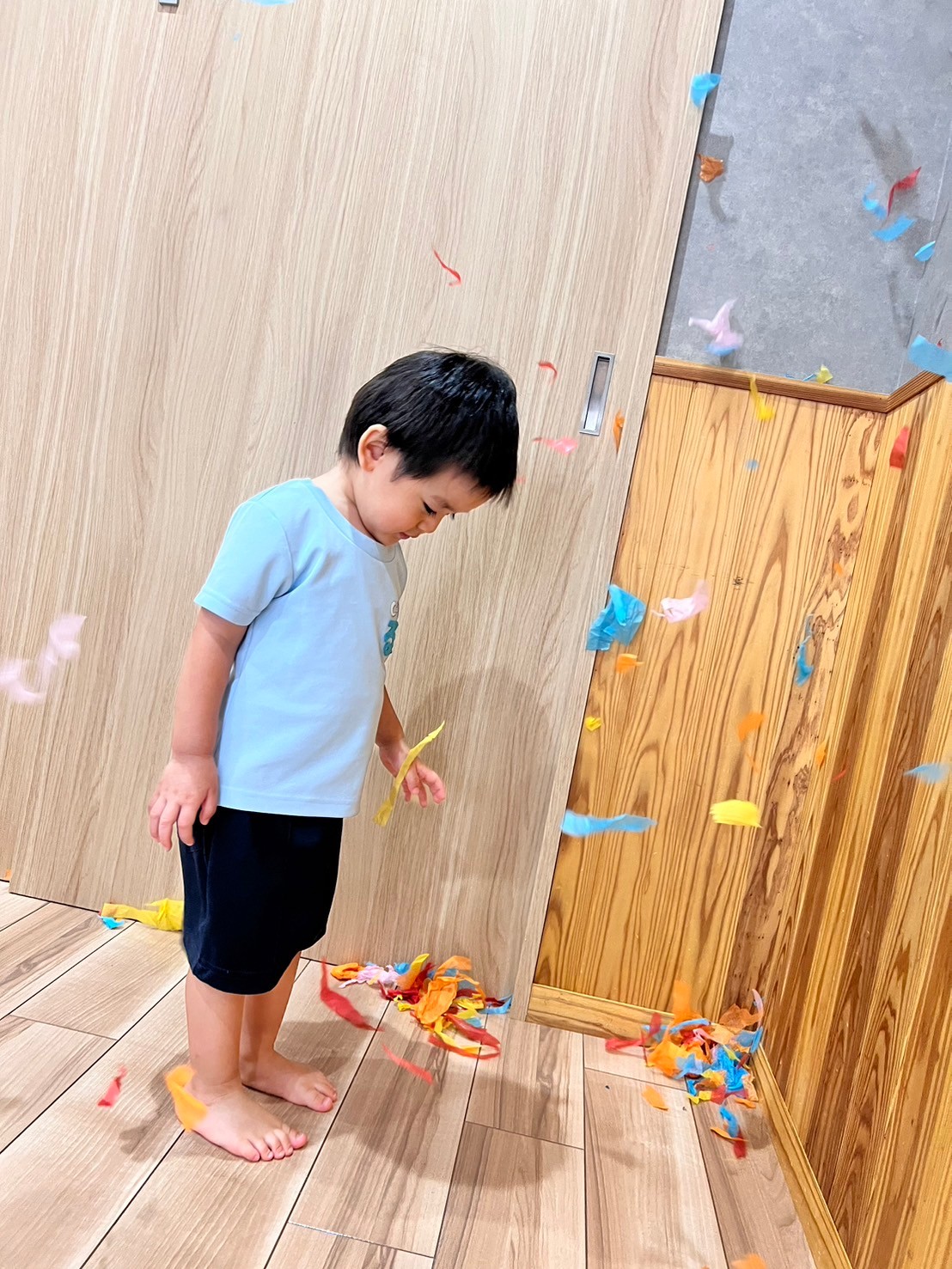 まず最初に季節の制作をしました!画用紙を破ると中からカラフルな模様が見えてきて集中して破っていくりす組さんでしたよ!目と口をつけたらおばけさんの完成です👻 その後は花紙を使って遊びましたよ🎶細かくびりびりと破りそれを中心に集めうちわで仰ぐとふぁーっと花紙が舞い、ヒラヒラととんだり落ちてくる様子を目で追って落ちてくる花紙の色を教えてくれたりとビジョントレーニングをしながら室内遊びを楽しみました🥰